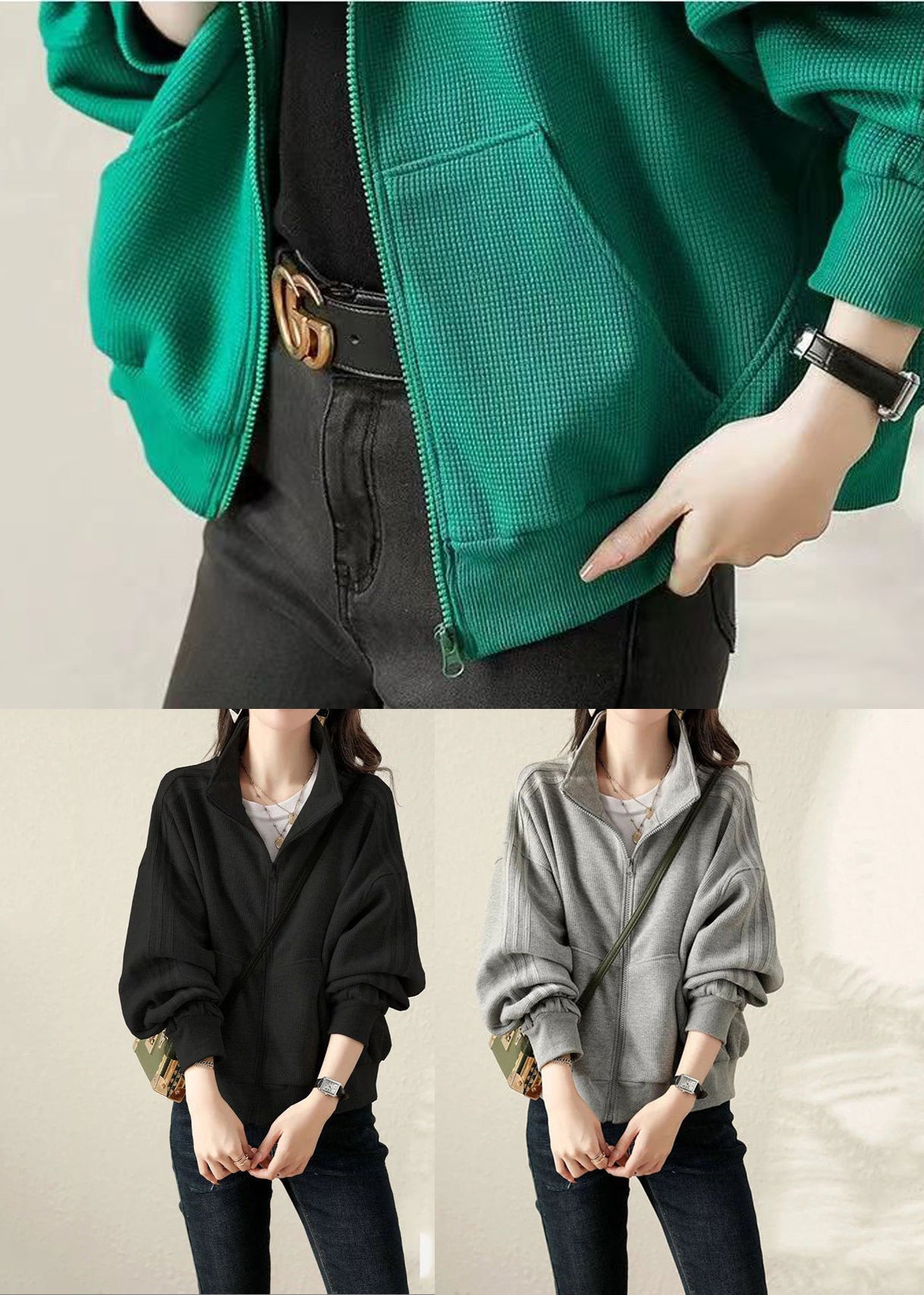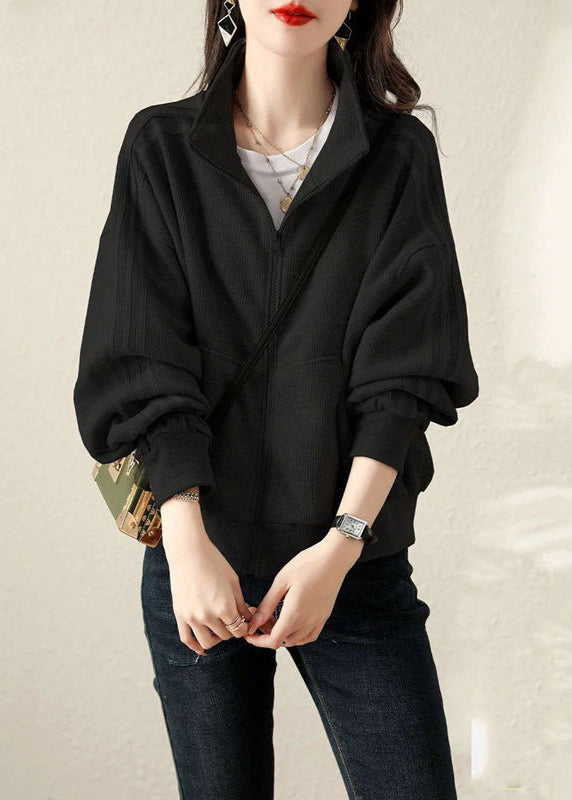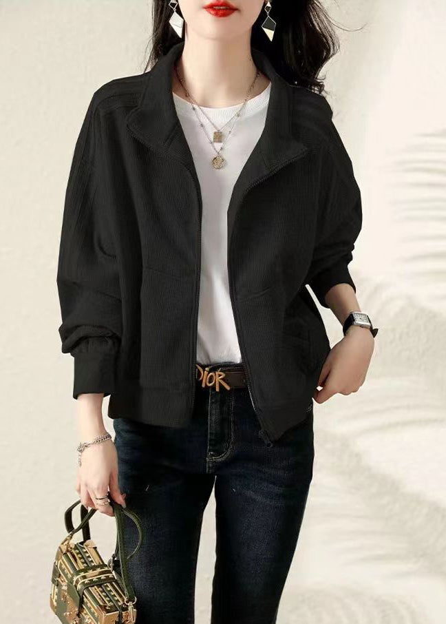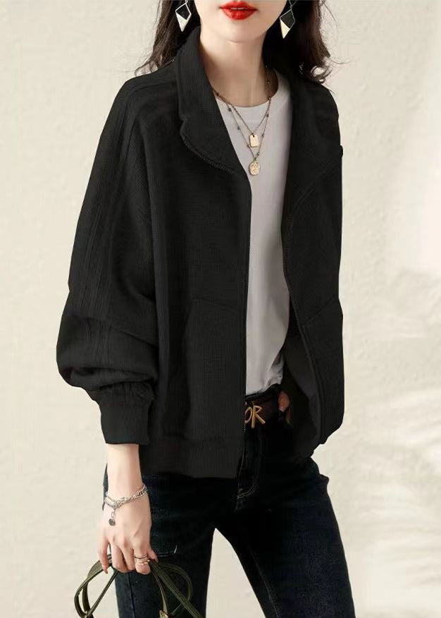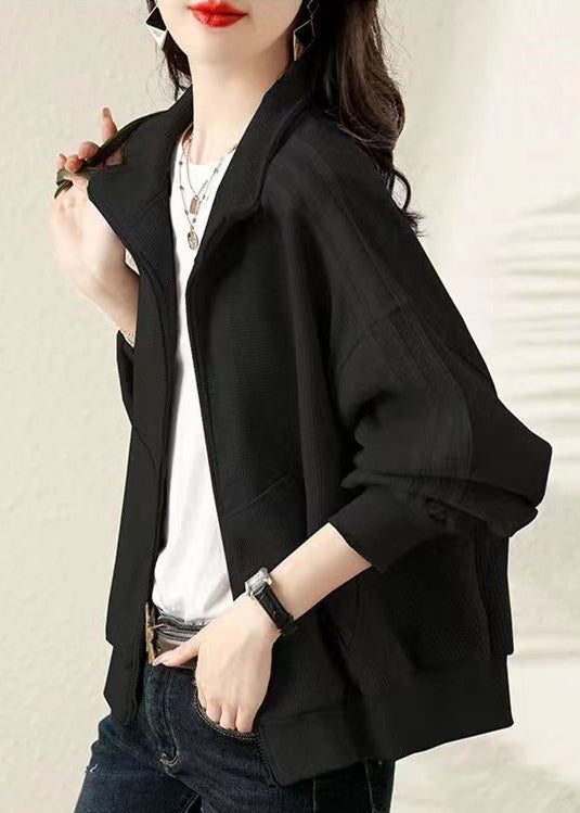 Black Patchwork Cotton Jackets Oversized Zippered Fall