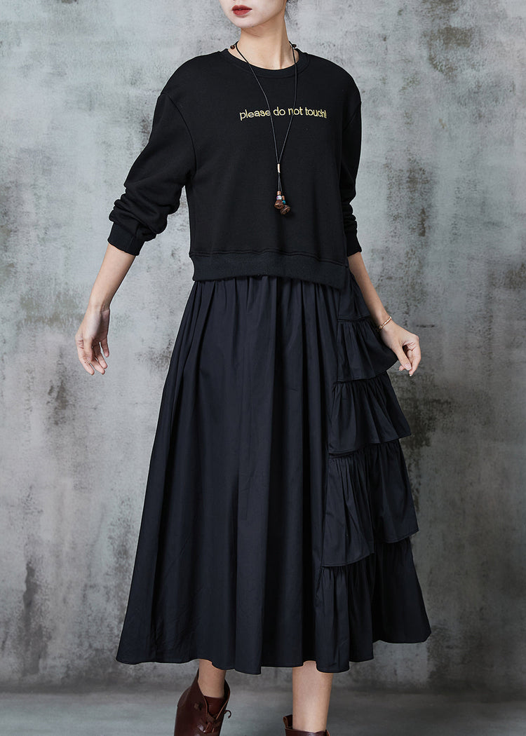 Black Patchwork Cotton Sweatshirt Dress Layered Ruffled Spring