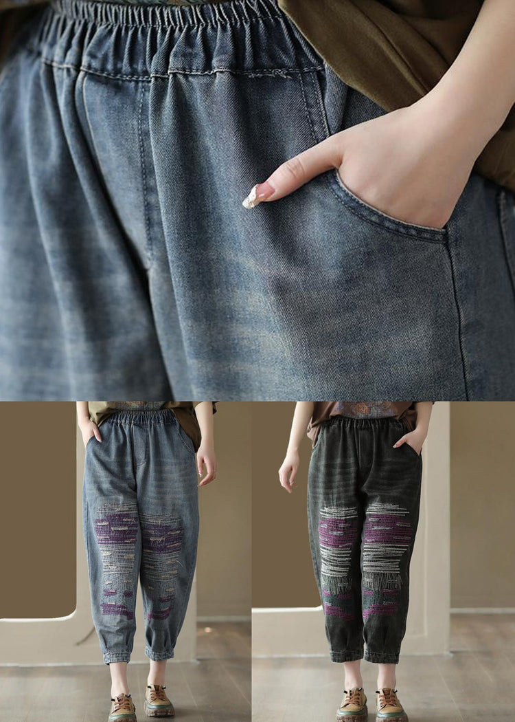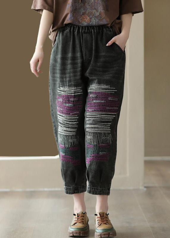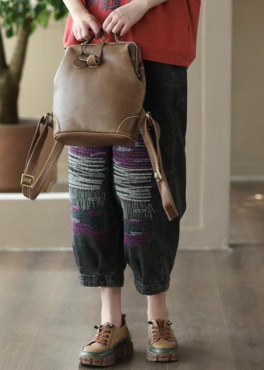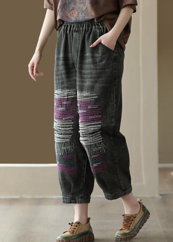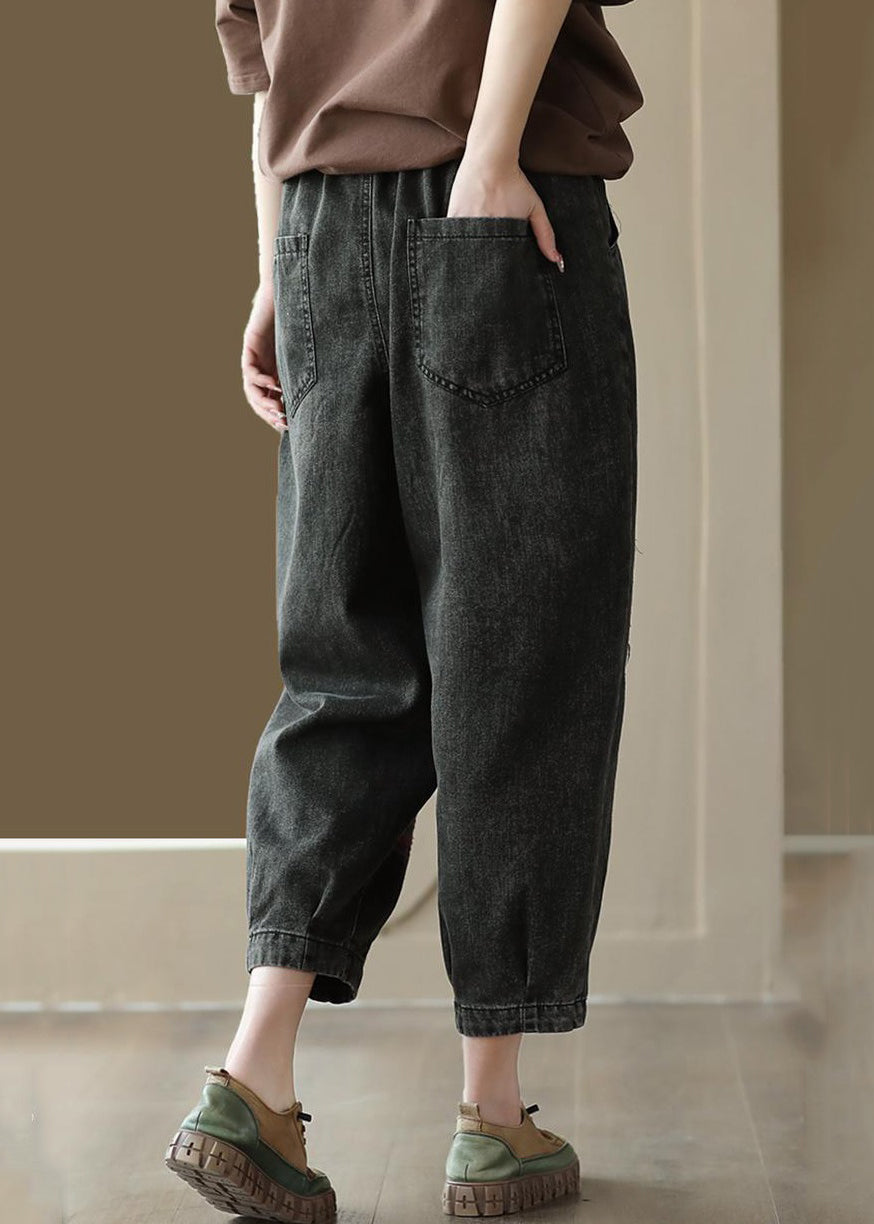 Black Patchwork Denim Loose Crop Pants Elastic Waist