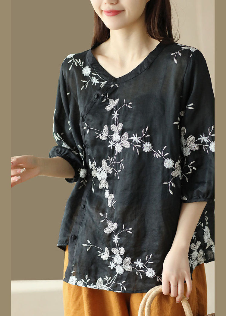 Black Patchwork Linen Top O-Neck Embroideried Button Summer
