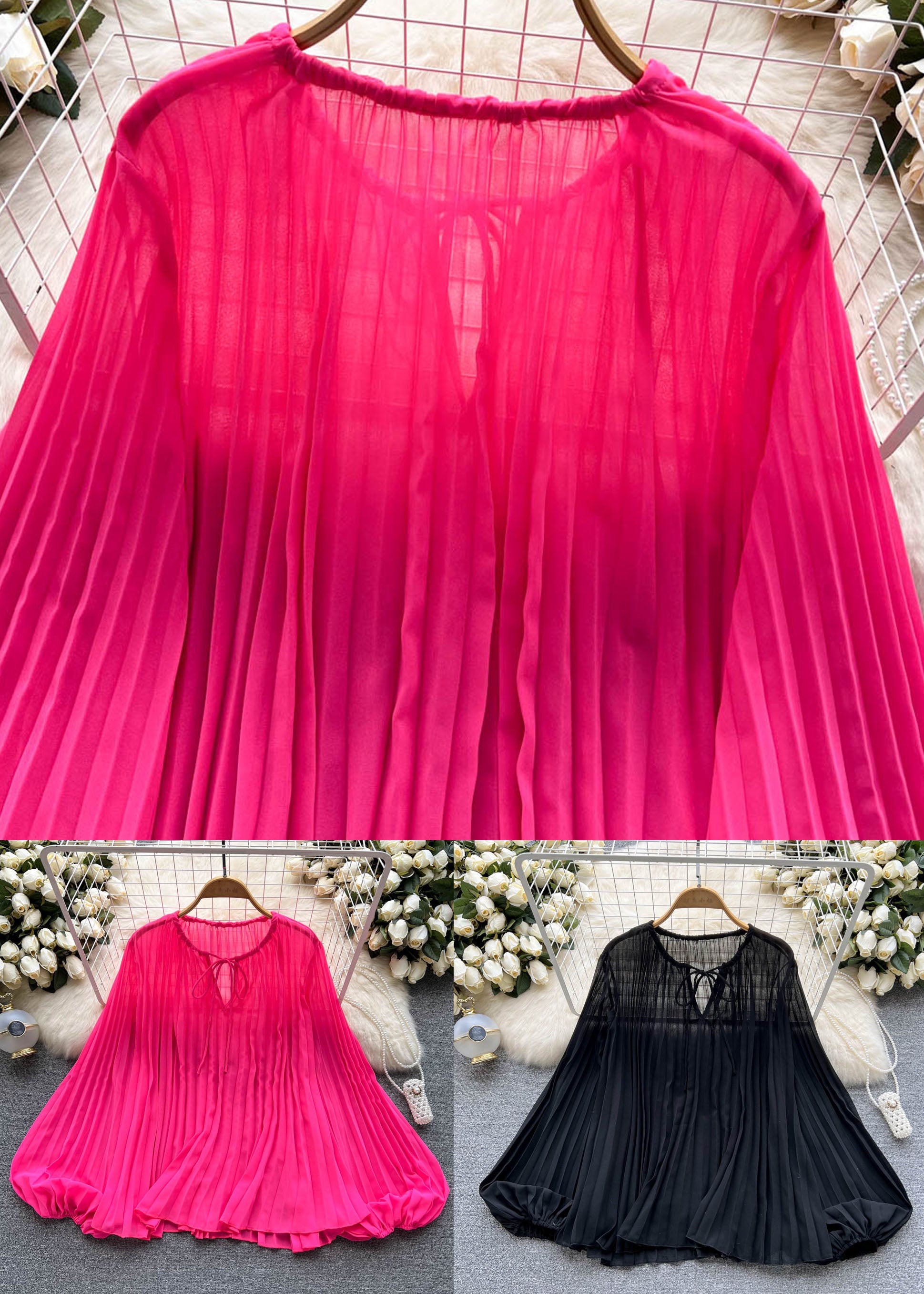 Black Patchwork Loose Chiffon Top O Neck Wrinkled Lace Up Summer