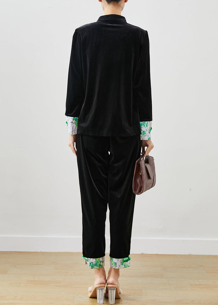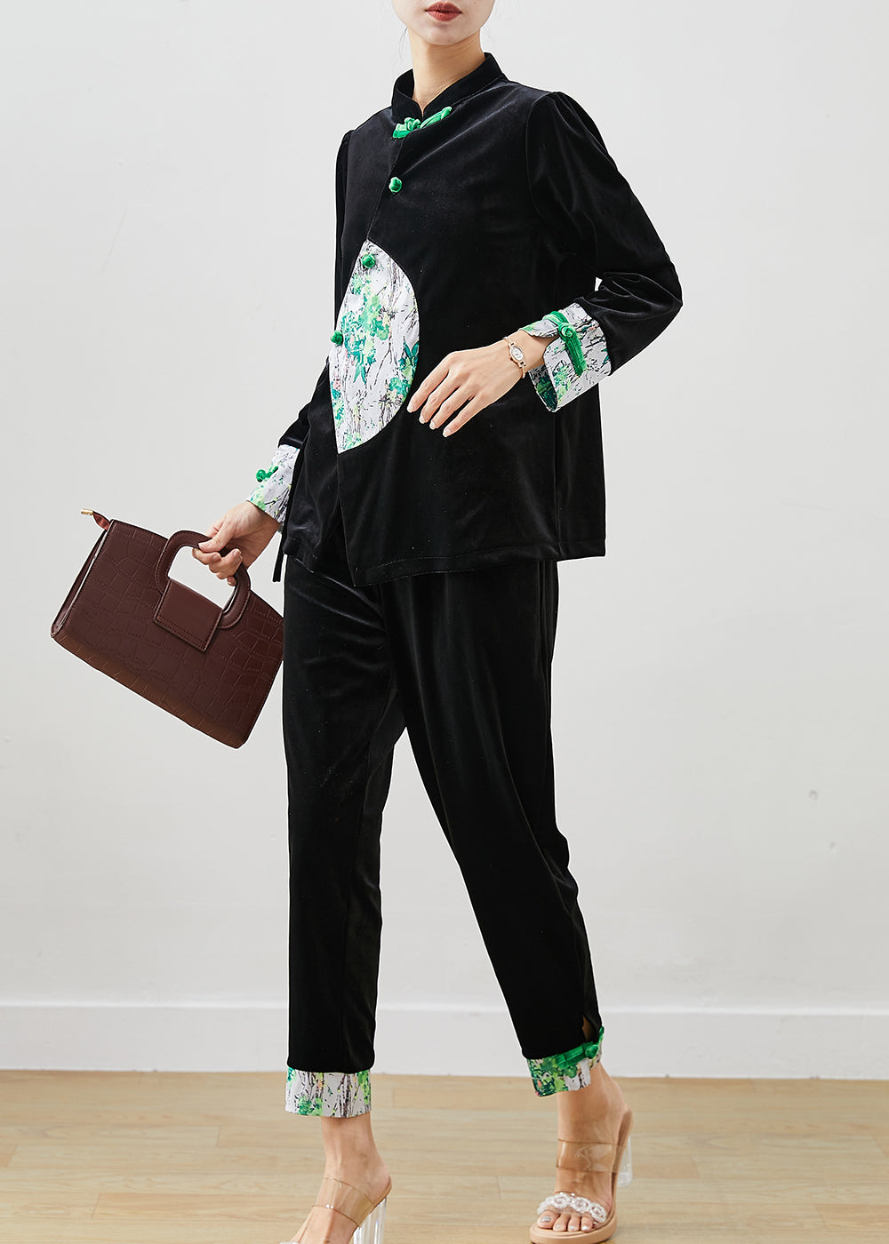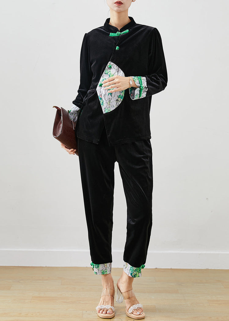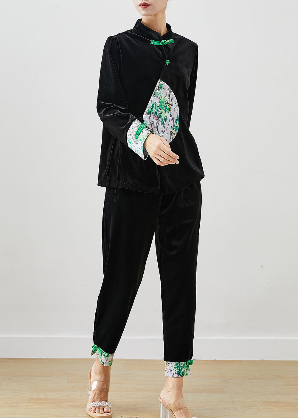 Black Patchwork Silk Velour Chinese Style Two Pieces Set Tie Waist Spring