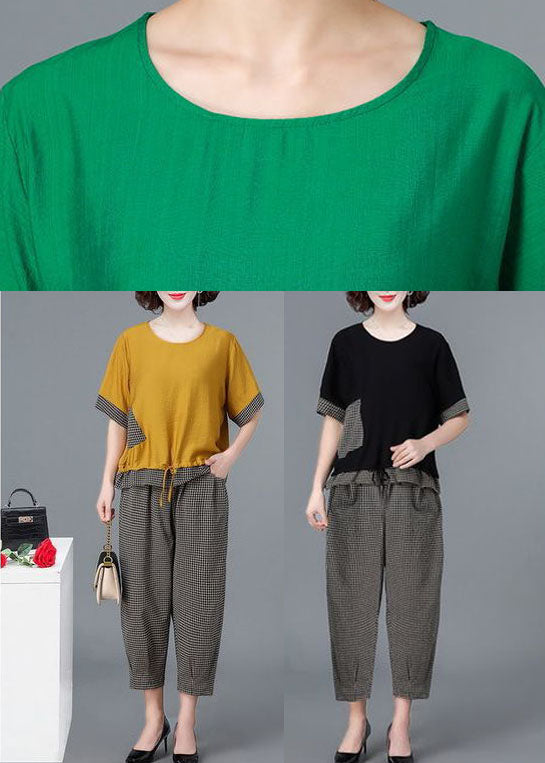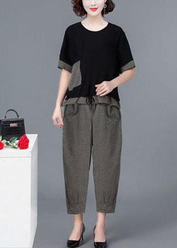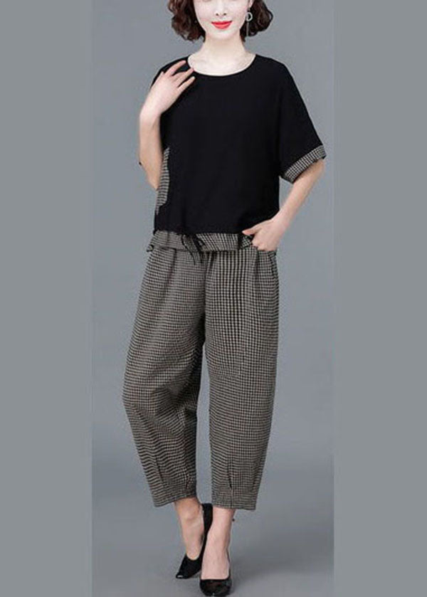 Black Plaid Patchwork Linen Tanks And Harem Pants Two Piece Set Women Clothing Drawstring Short Sleeve