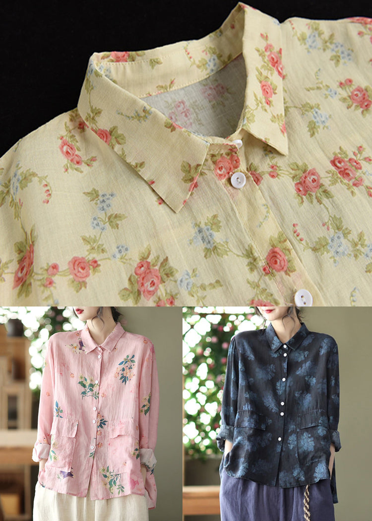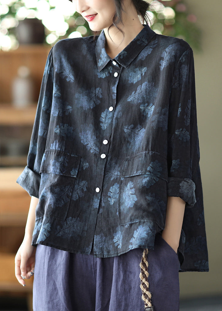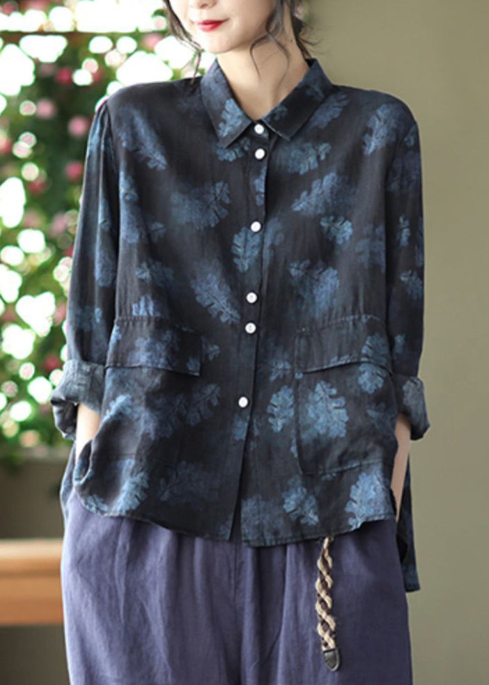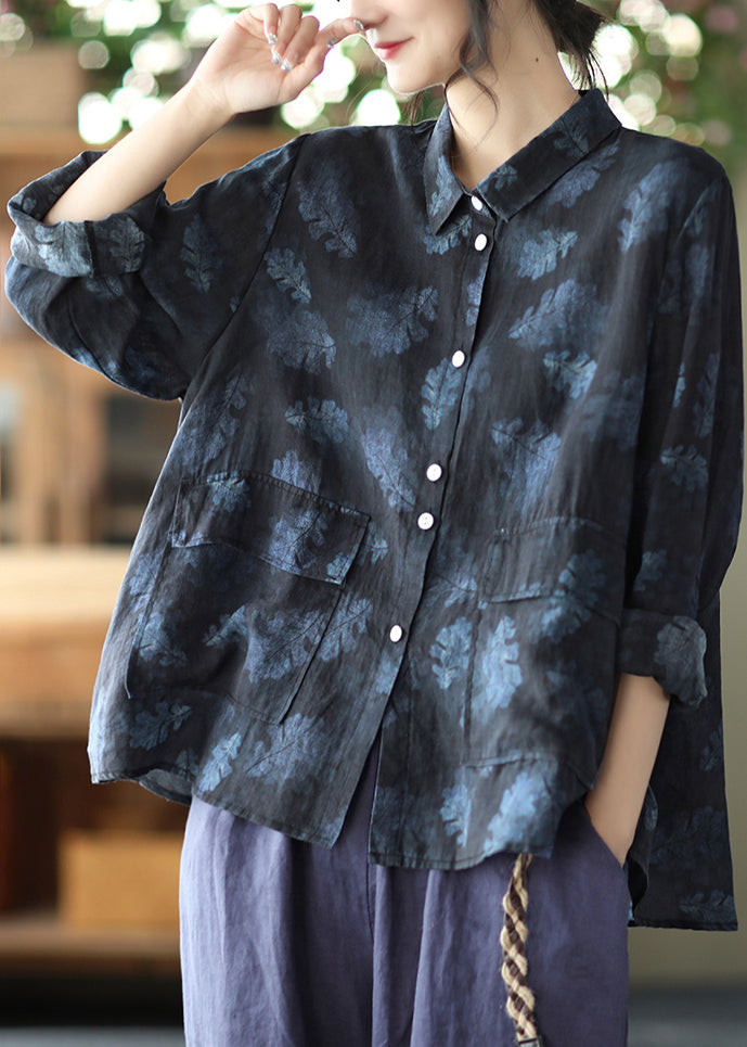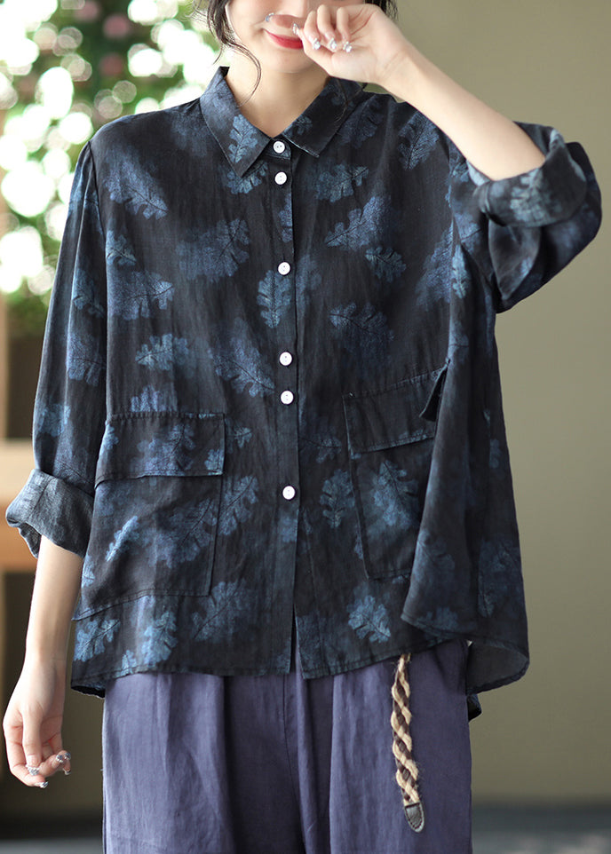 Black Pockets Linen Shirt Peter Pan Collar Spring