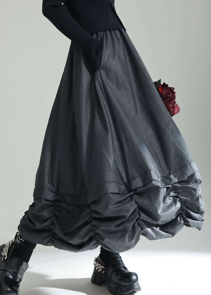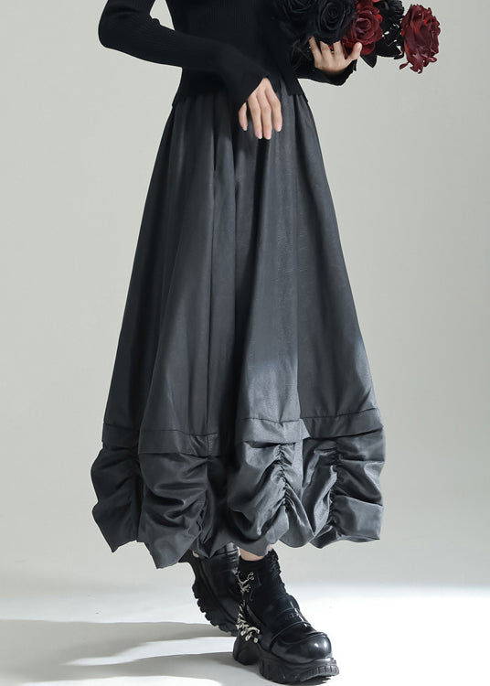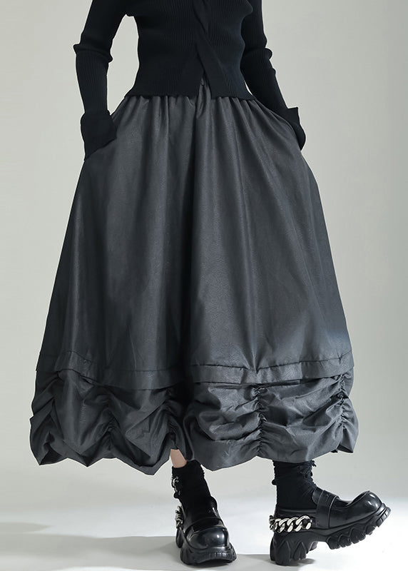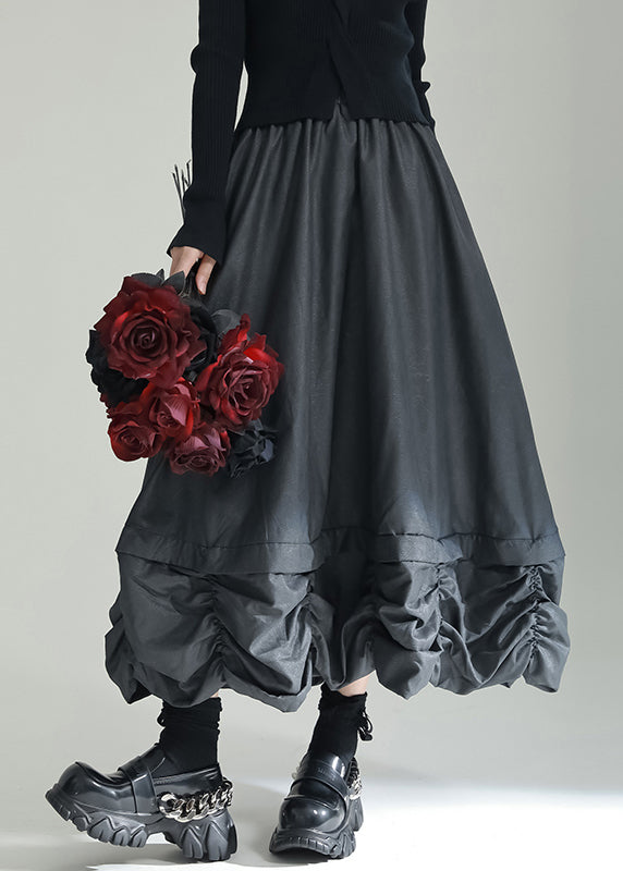 Black Pockets Patchwork Cotton Skirts Wrinkled Elastic Waist Fall