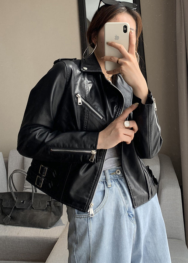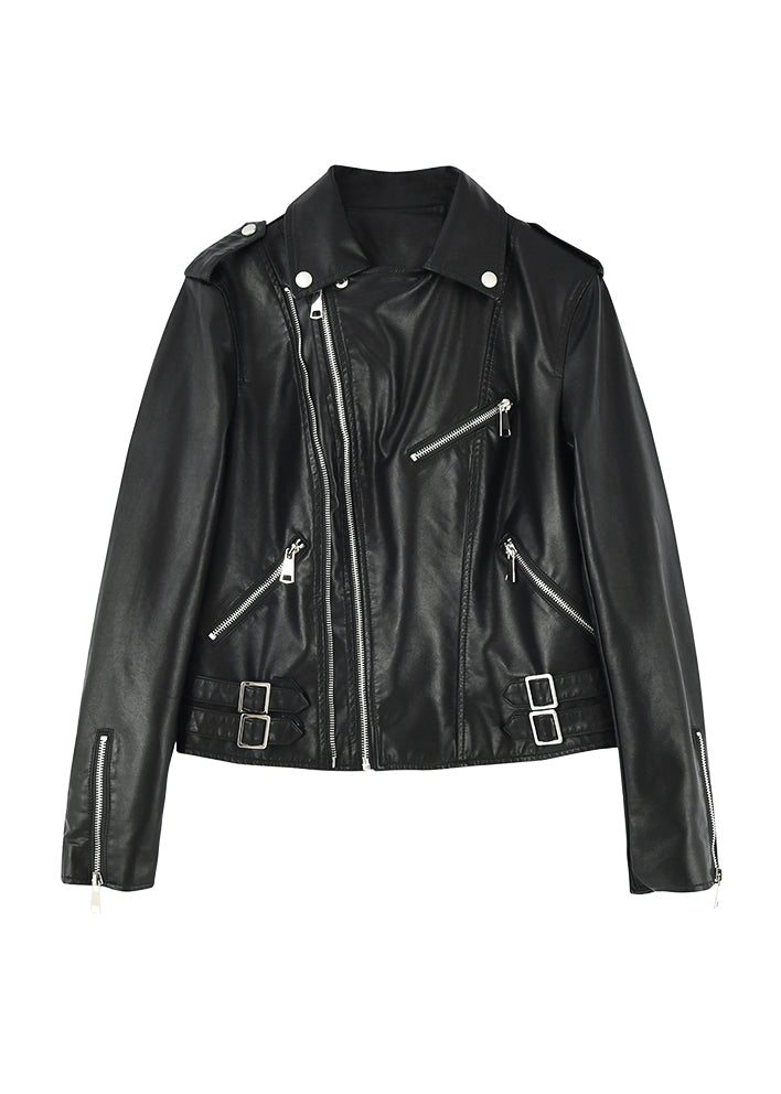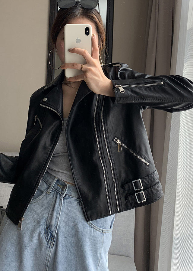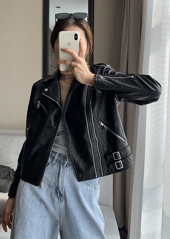 Black Pockets Patchwork Faux Leather Jacket Zip Up Fall