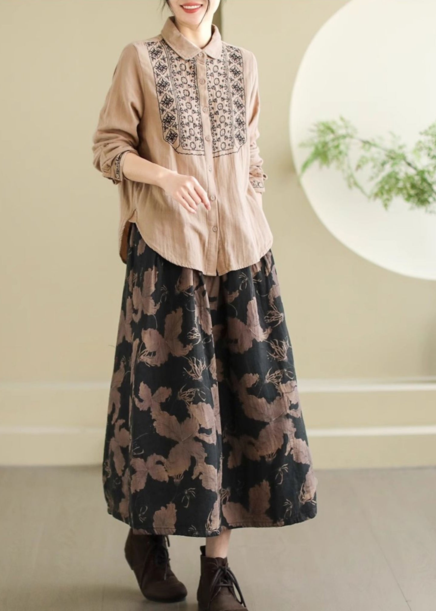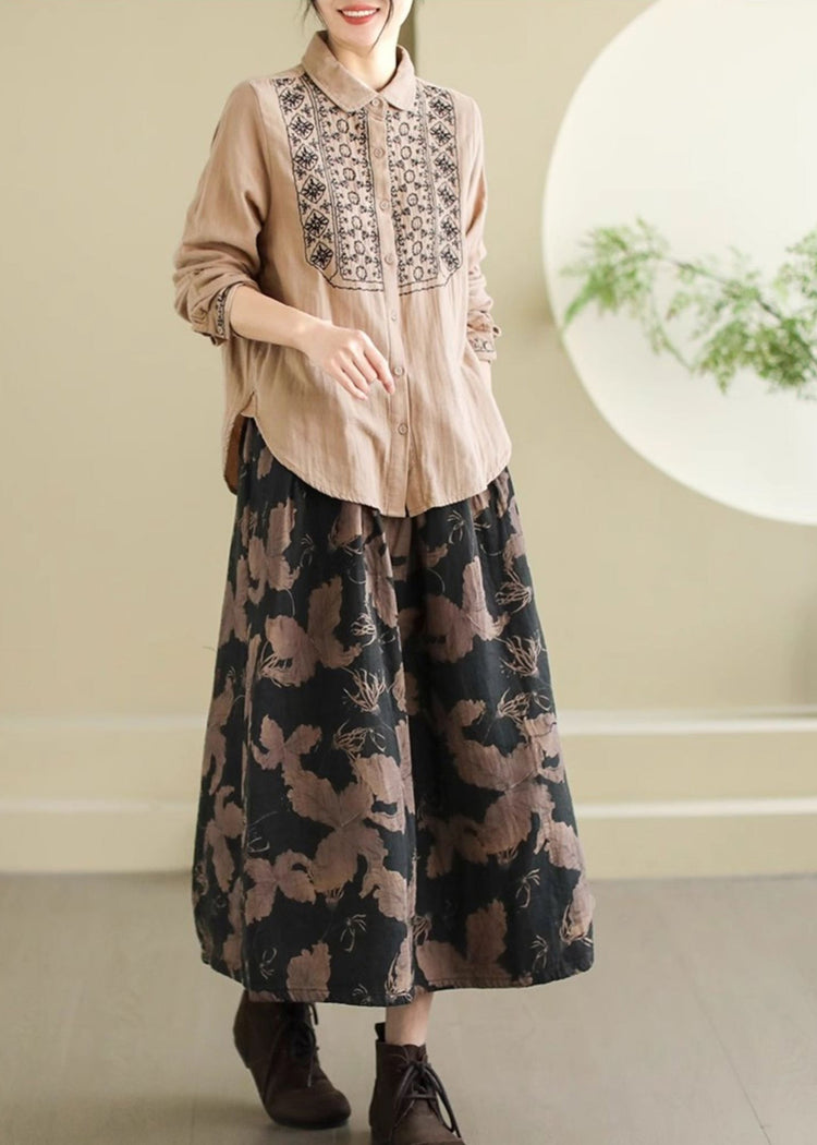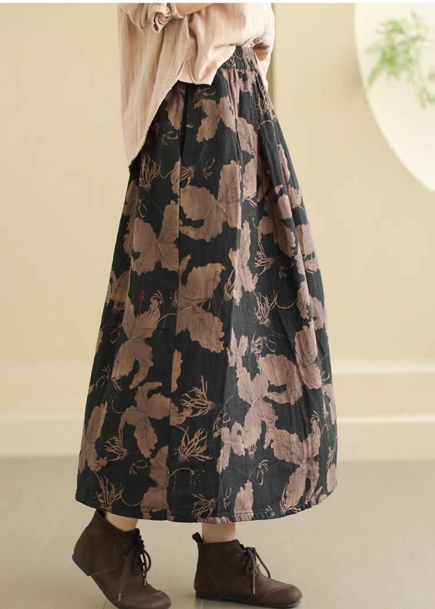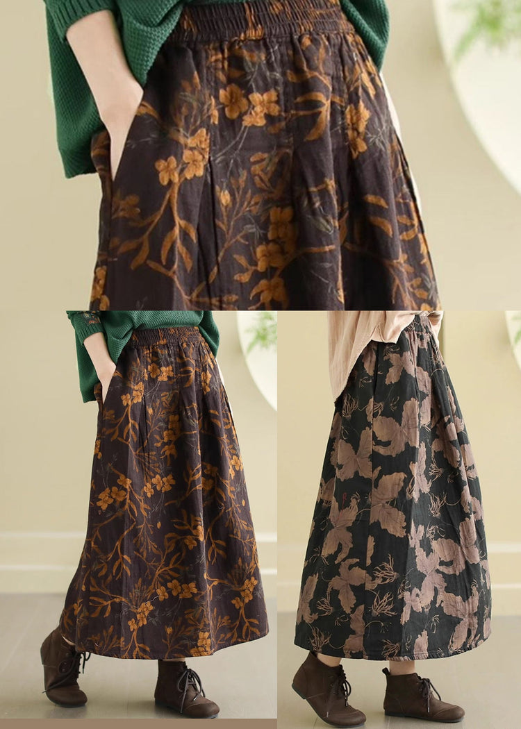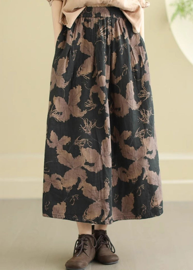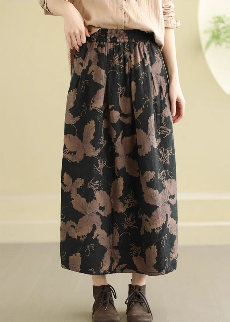 Black Print Cotton A Line Skirts Elastic Waist Spring