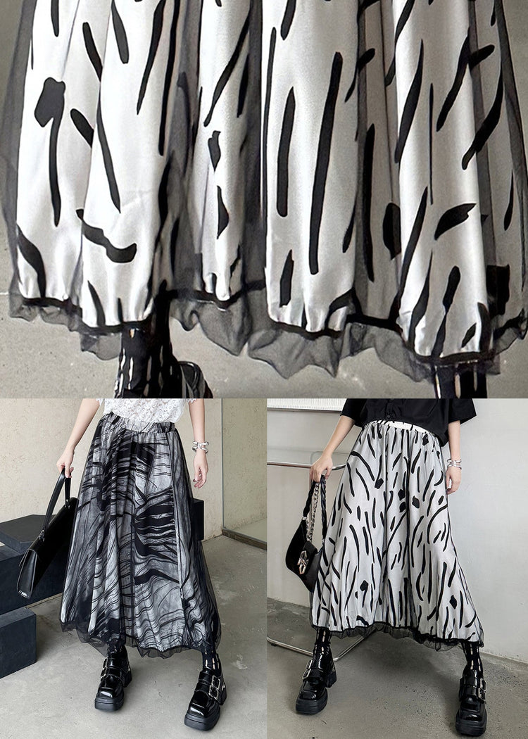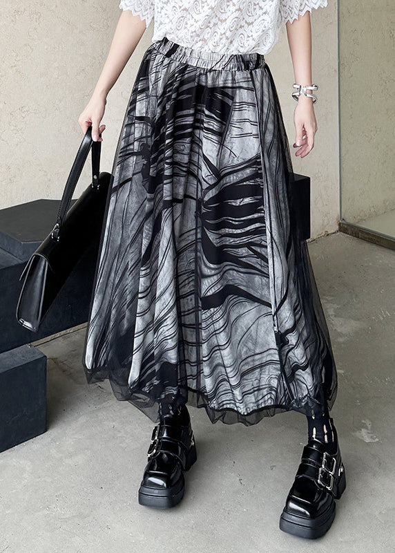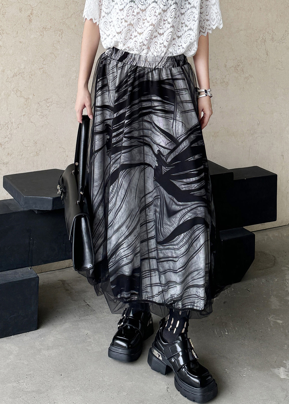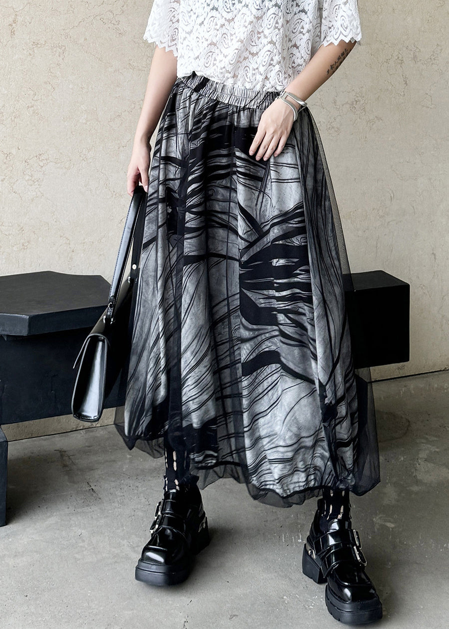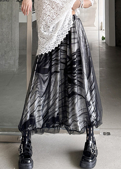 Black Print Tulle Patchwork Summer Skirts Elastic Waist
