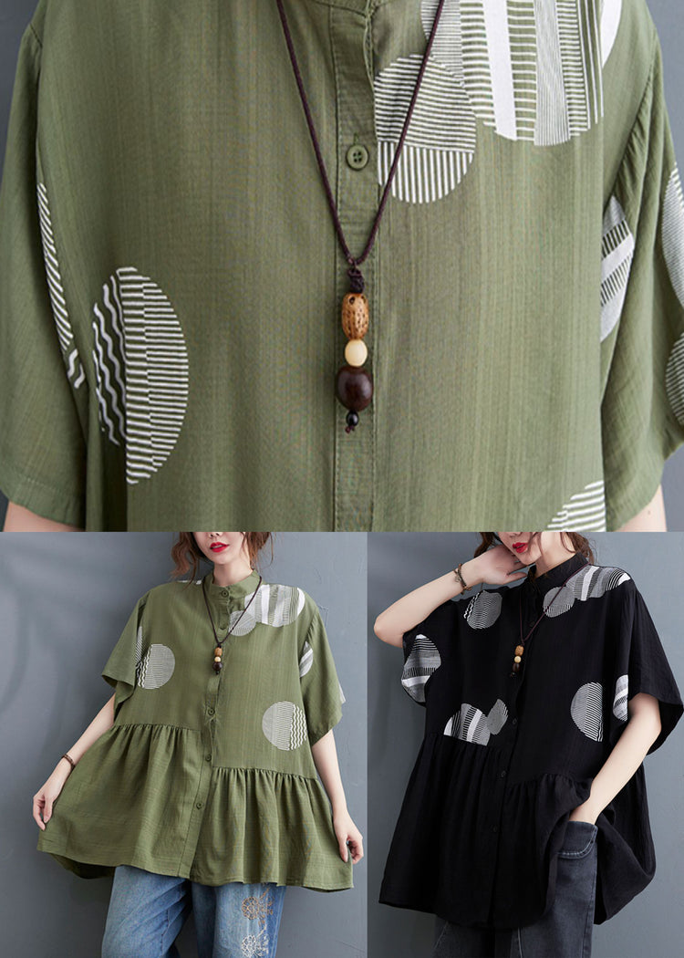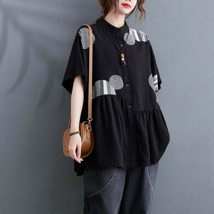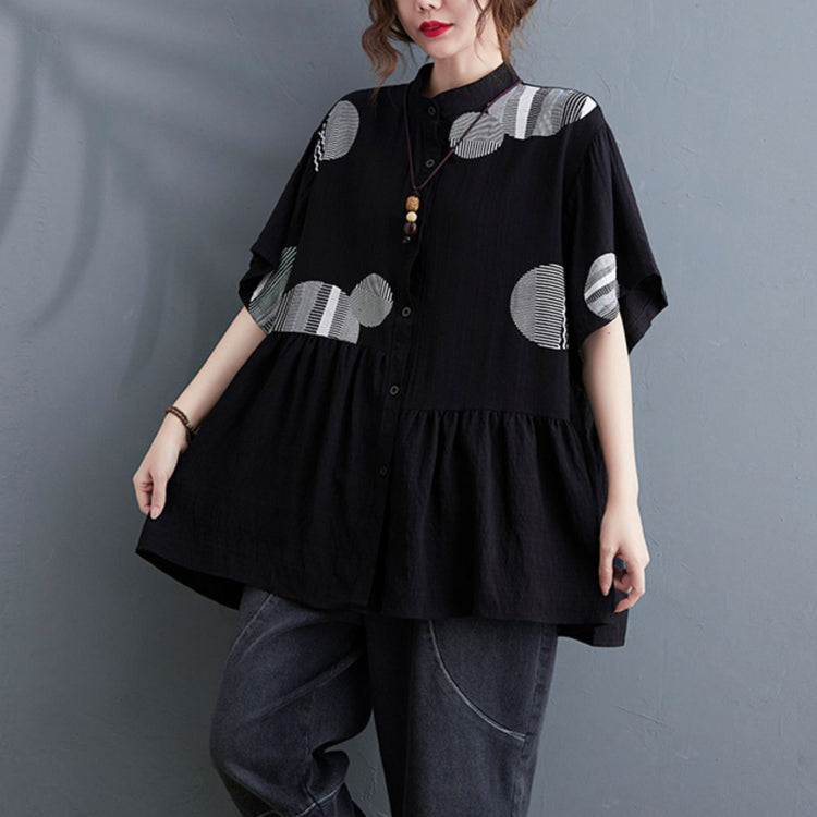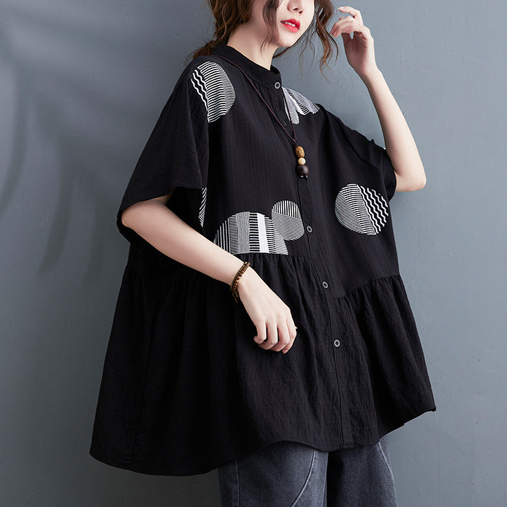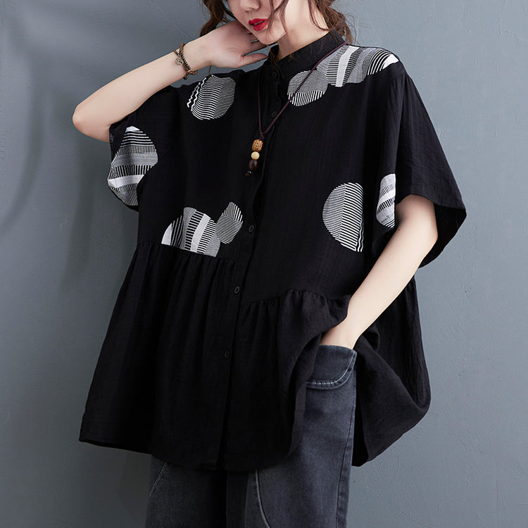 Black Shirt Tops Button wrinkled Asymmetrical Short Sleeve