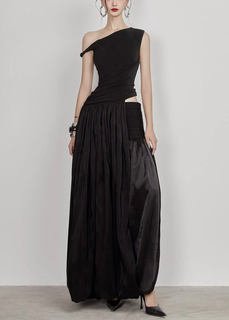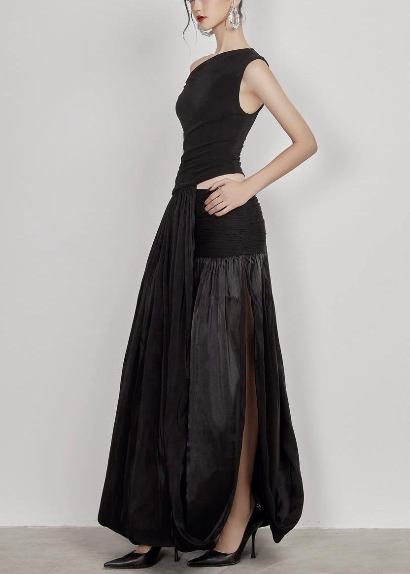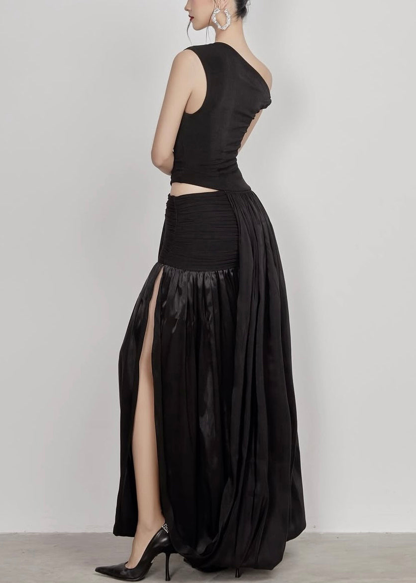 Black Side Open Solid Cotton Long Dress Cold Shoulder Sleeveless