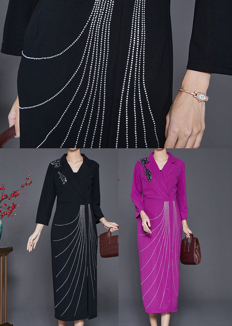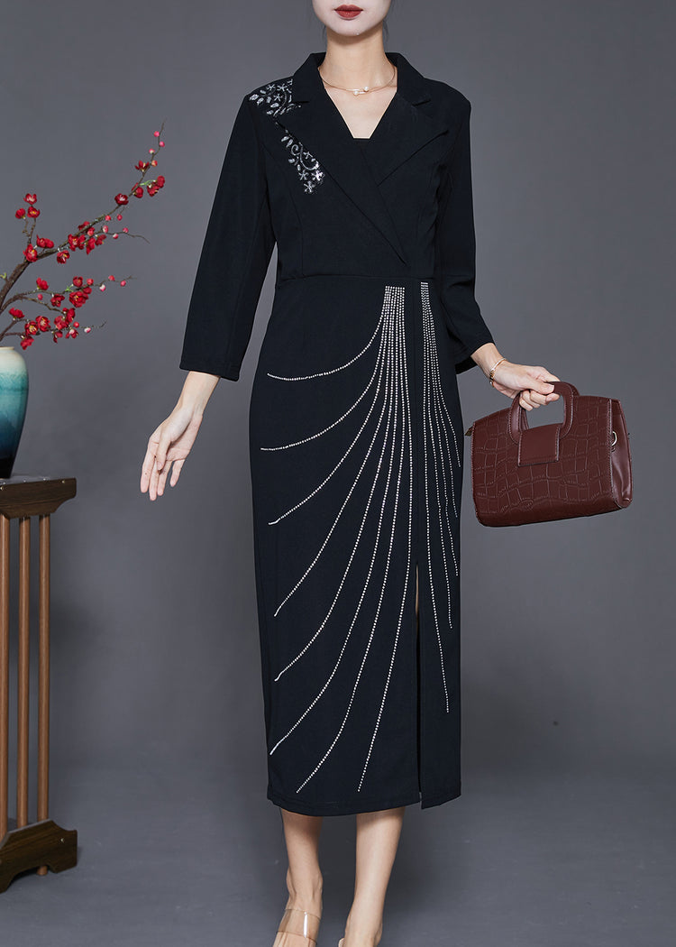 Black Silm Fit Cotton Long Dresses Notched Collar Fall