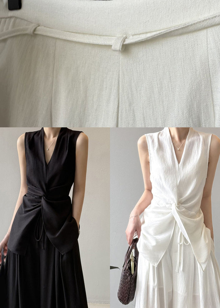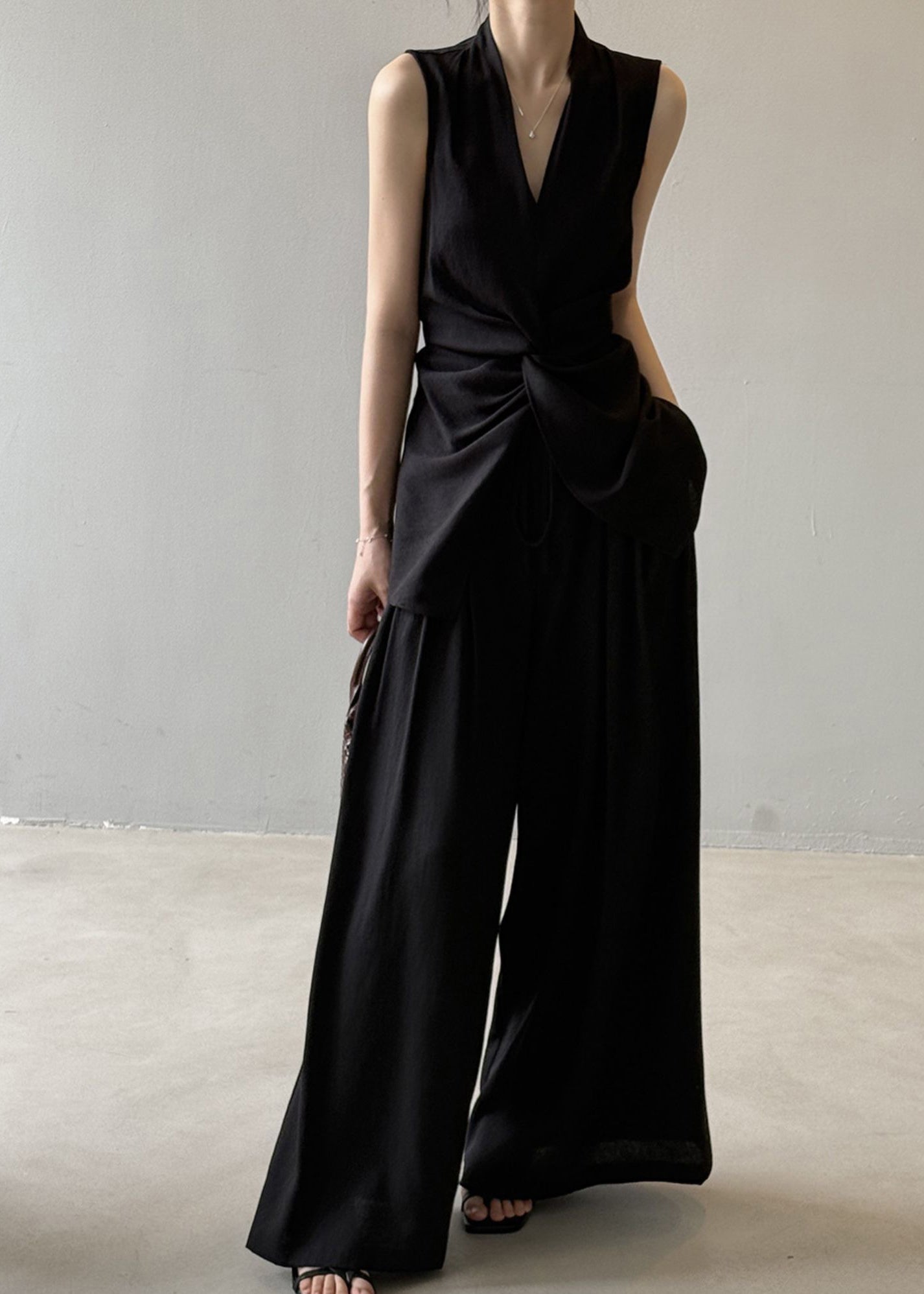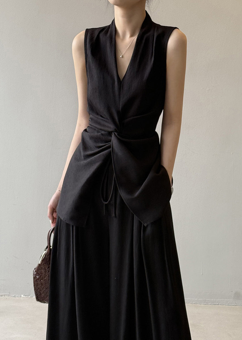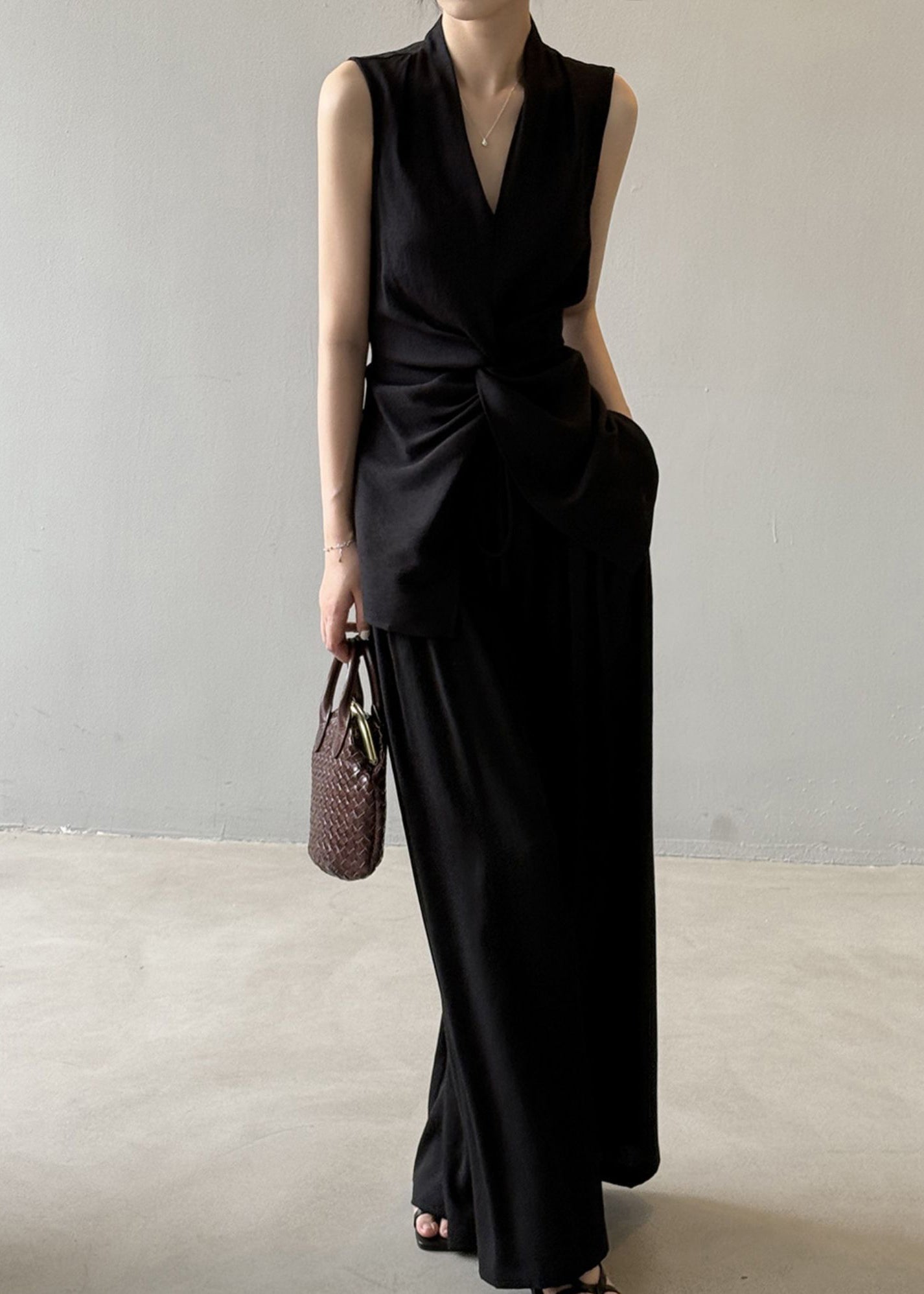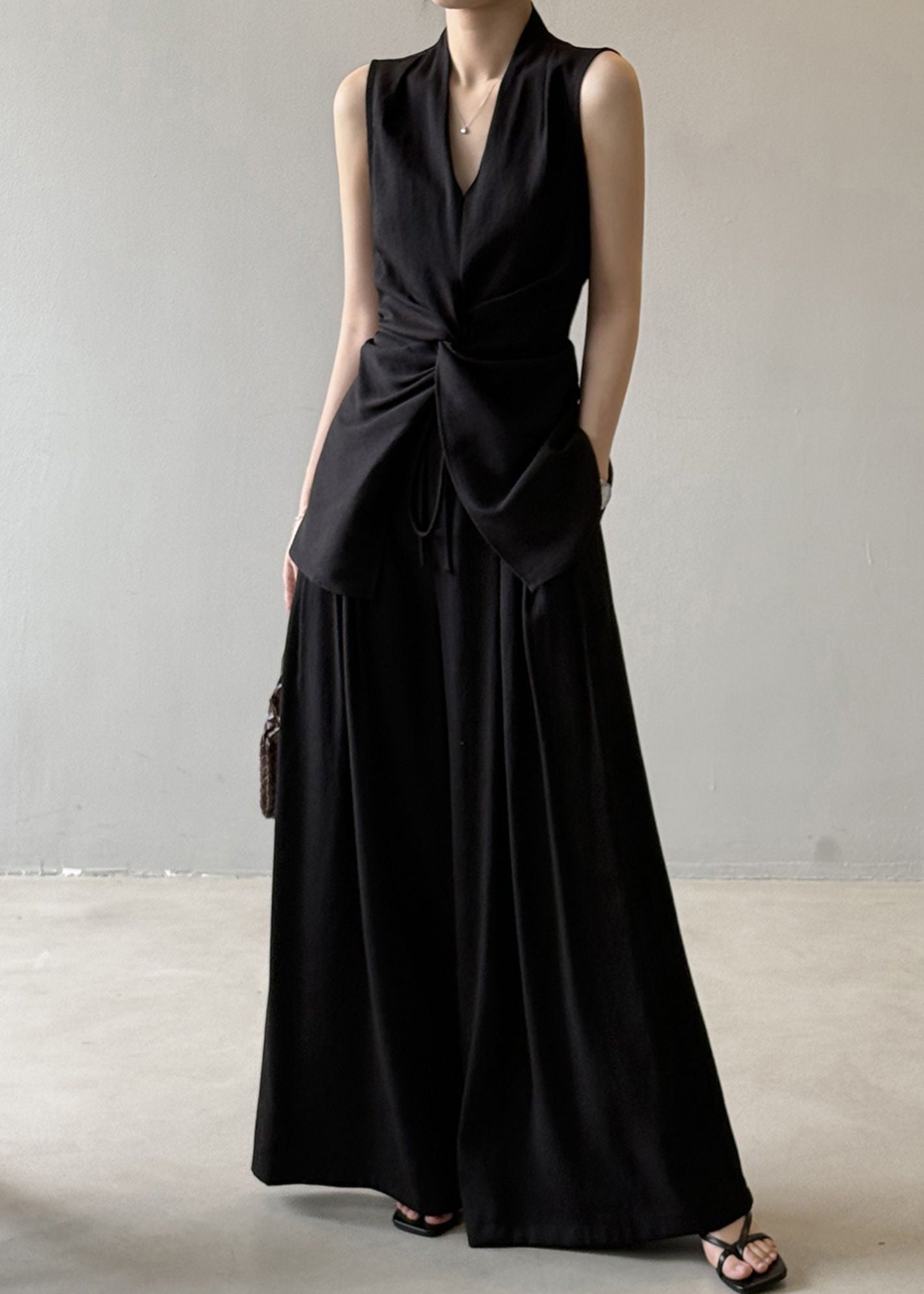Black Silm Linen Two-Piece Set Asymmetrical Wrinkled Sleeveless