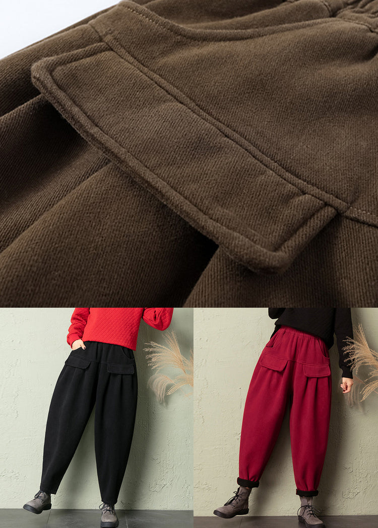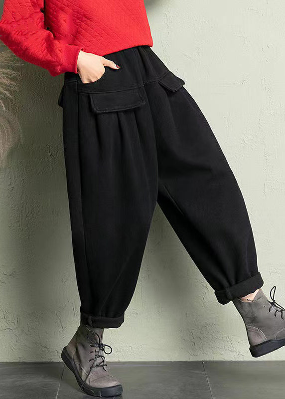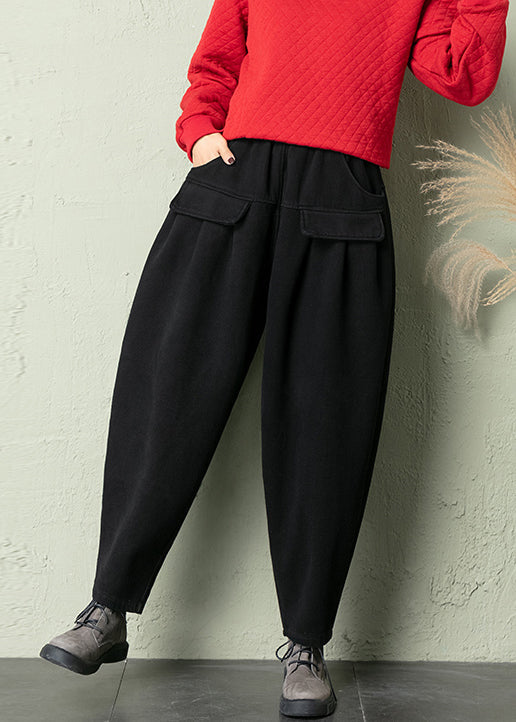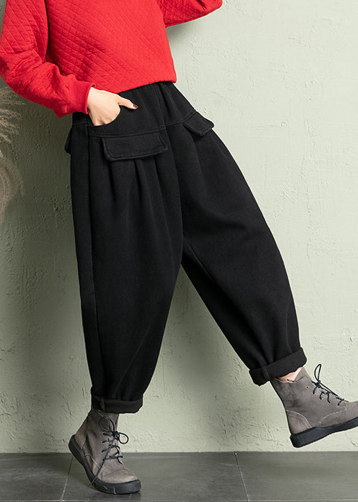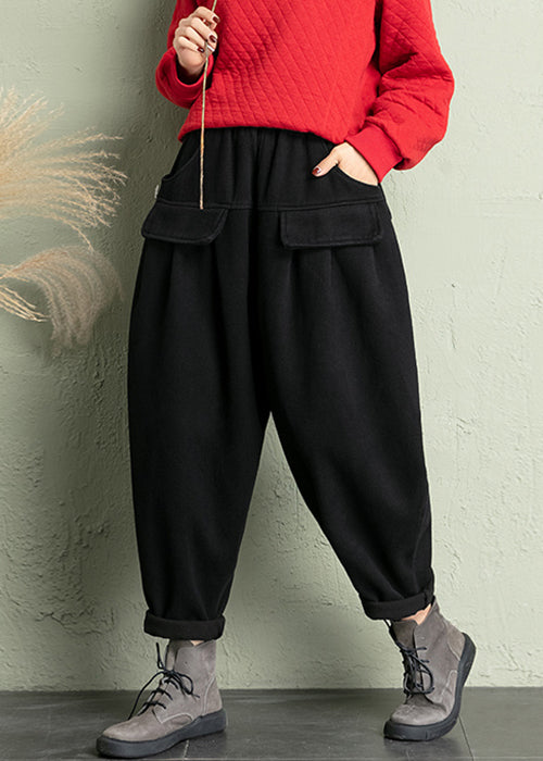 Black Solid Cotton Harem Pants Elastic Waist Spring