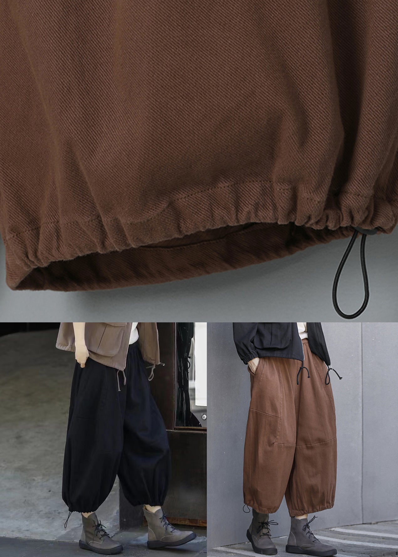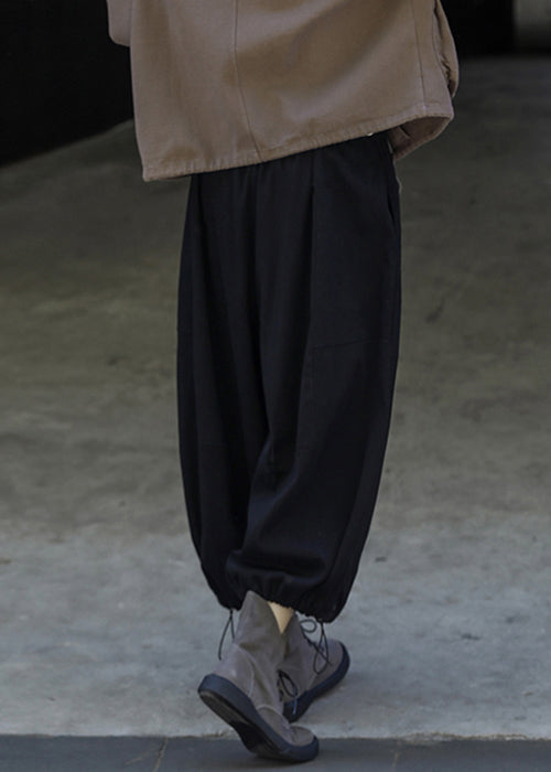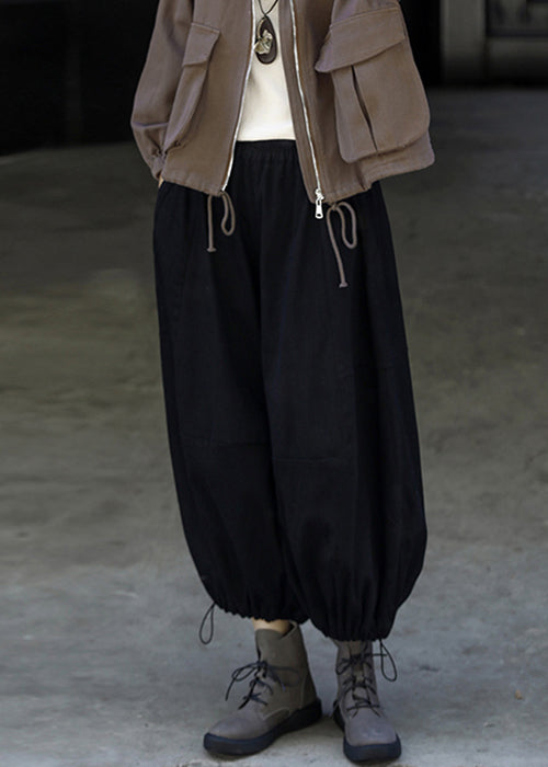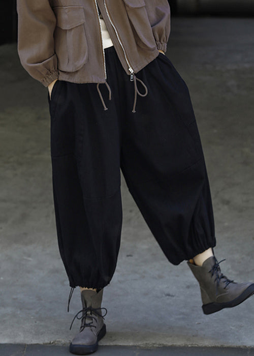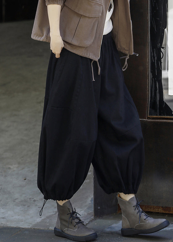 Black Solid Drawstring Cotton Lantern Pants High Waist