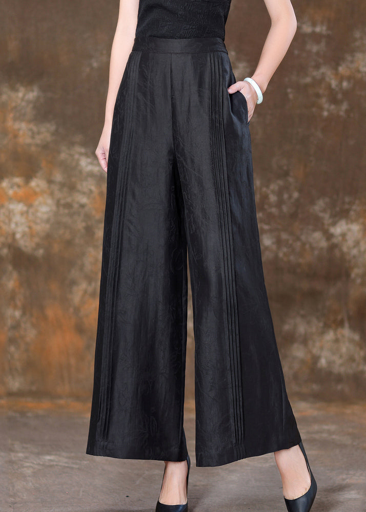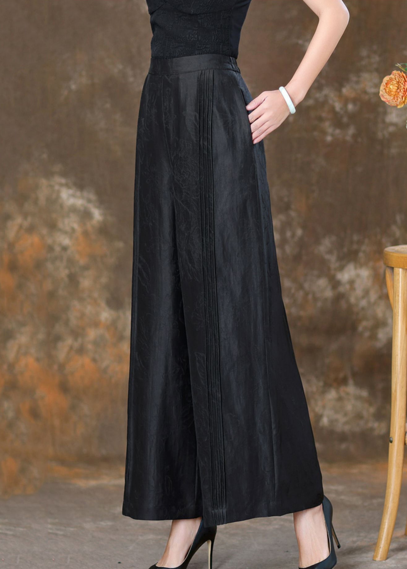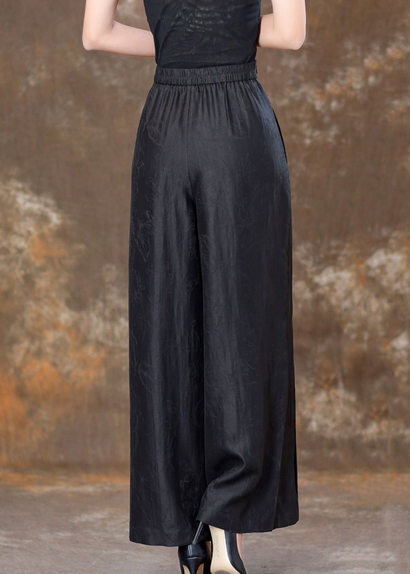 Black Solid Patchwork Silk Velour High Waist Wide Leg Pants