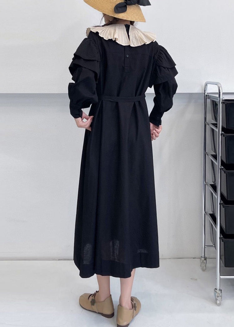 Black Solid Pockets Cotton Dress Ruffled Summer