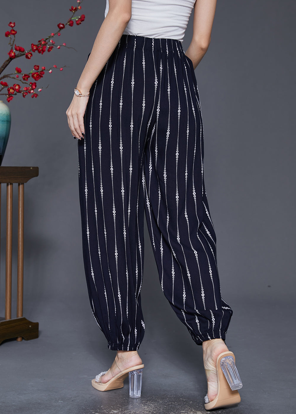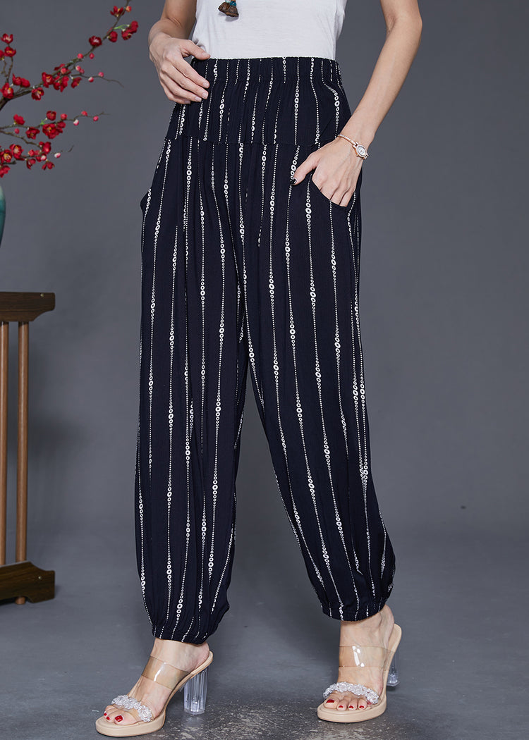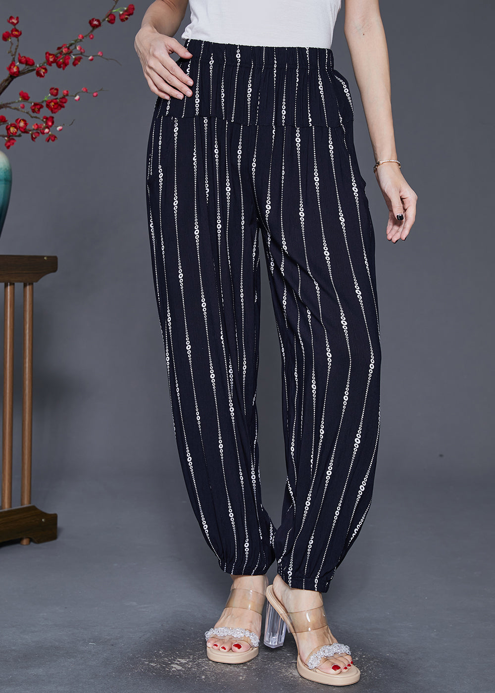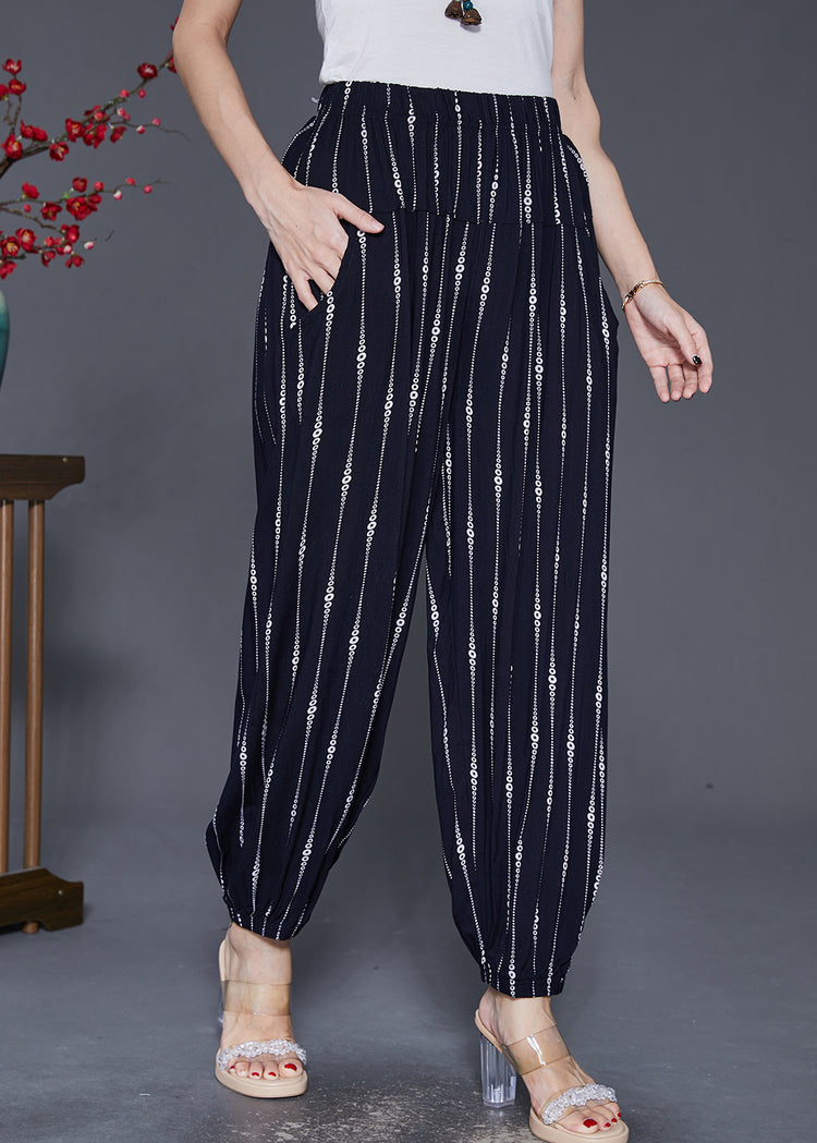 Black Striped Cotton Harem Pants Oversized Elastic Waist Fall