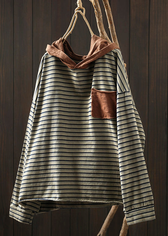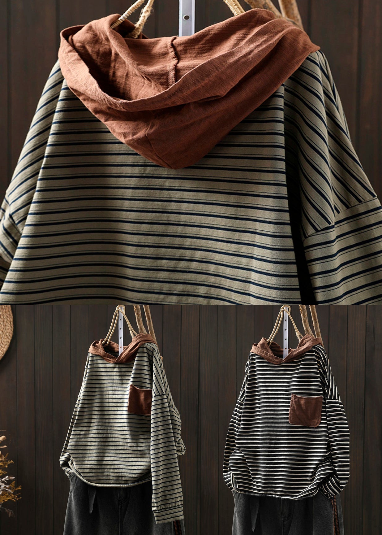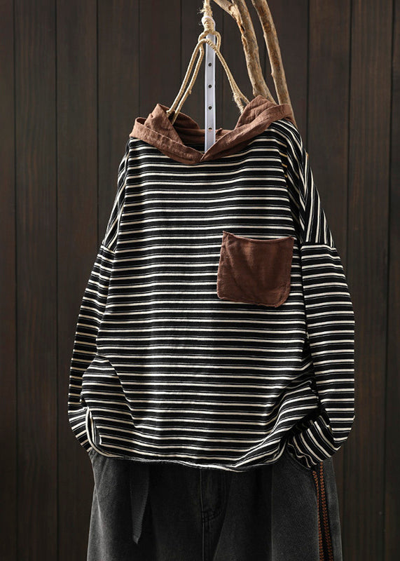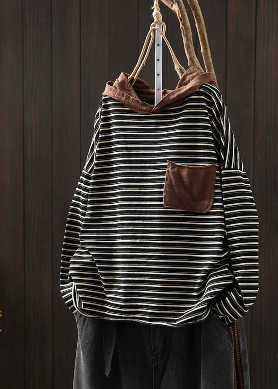 Black Striped Pockets Patchwork Cotton Blouse Tops Hooded Fall