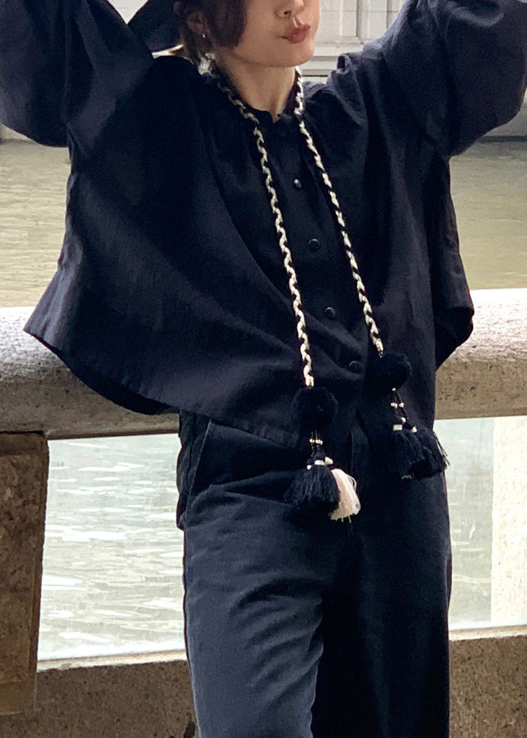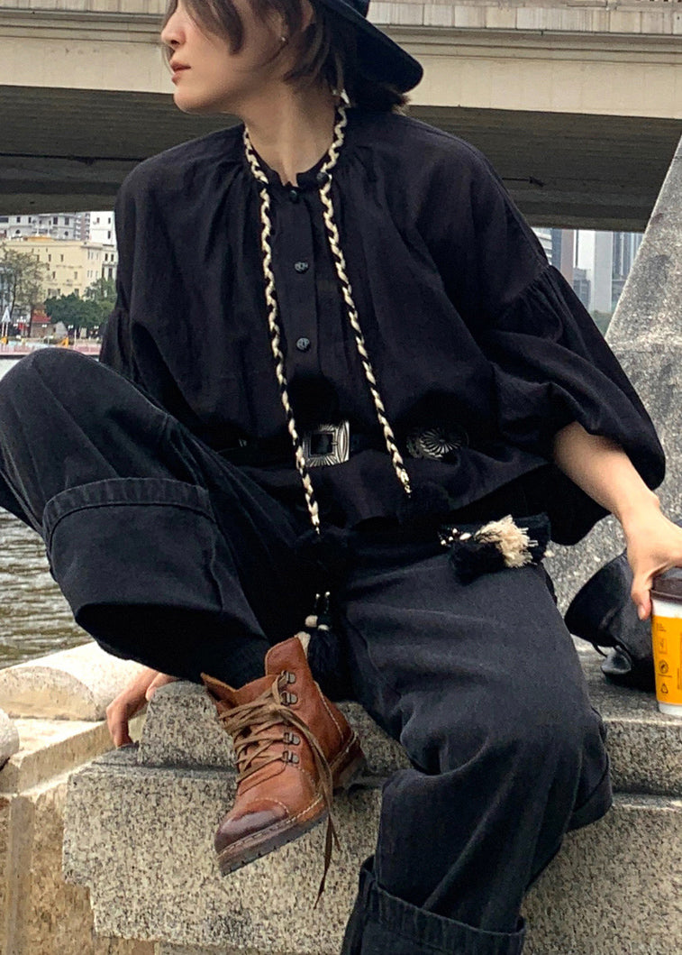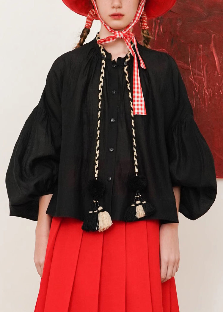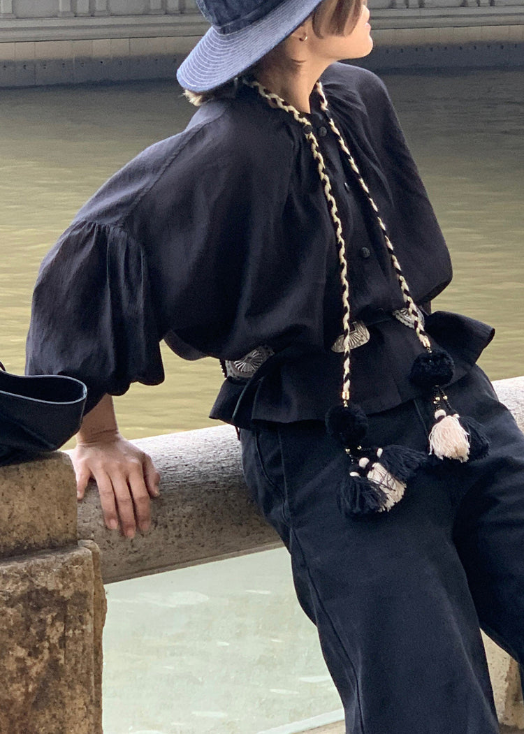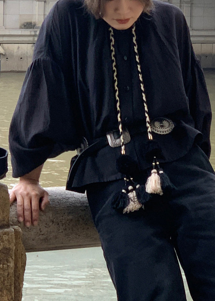 Black Tasseled Cotton Shirts Button Lantern Sleeve