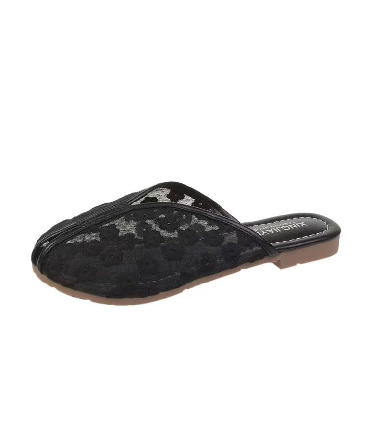 Black Tulle Slide Sandals Hollow Out Embroidery Splicing