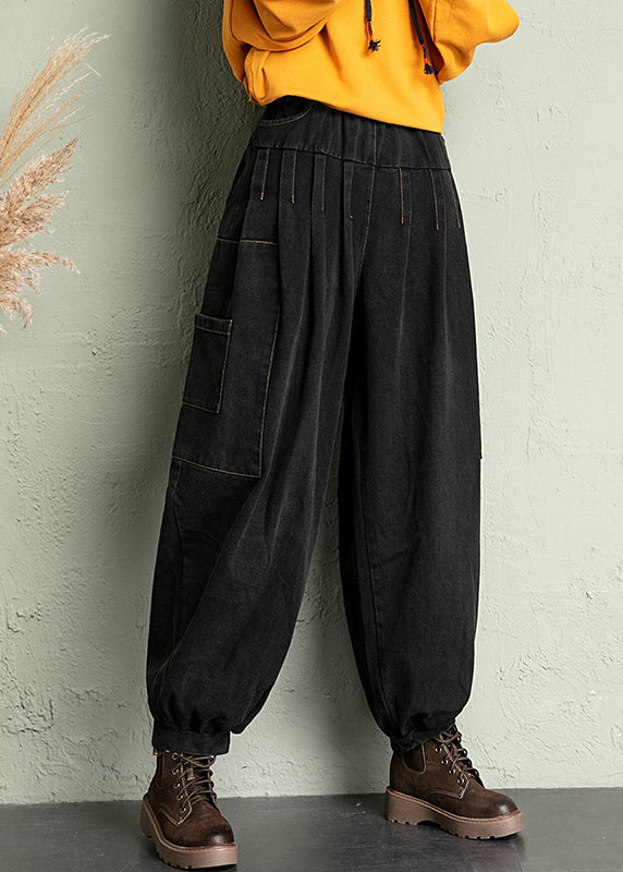 Black Wrinkled Loose Denim Lantern Pants High Waist Spring