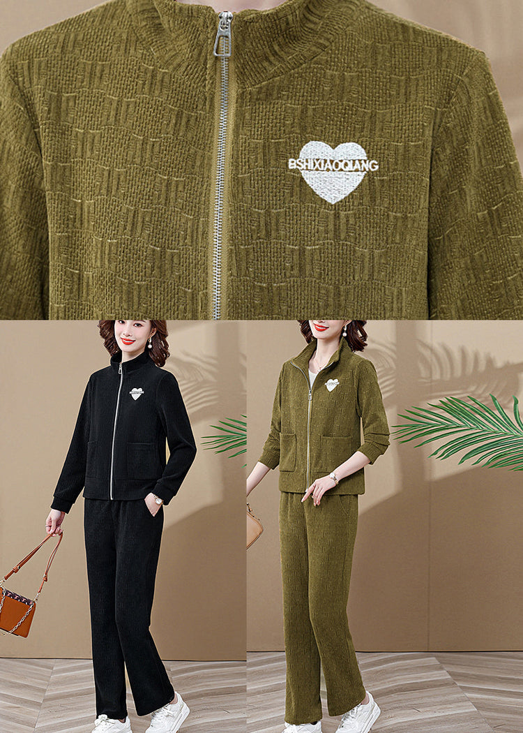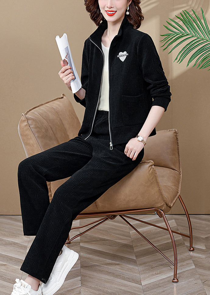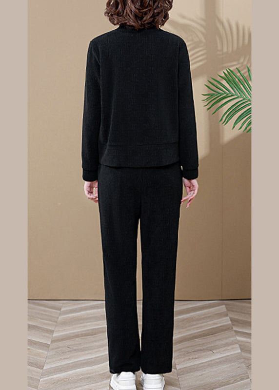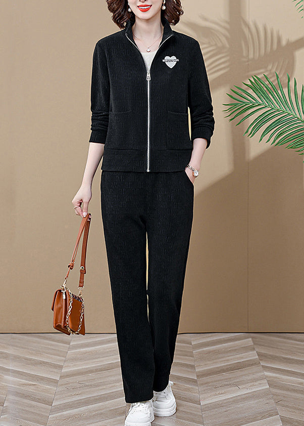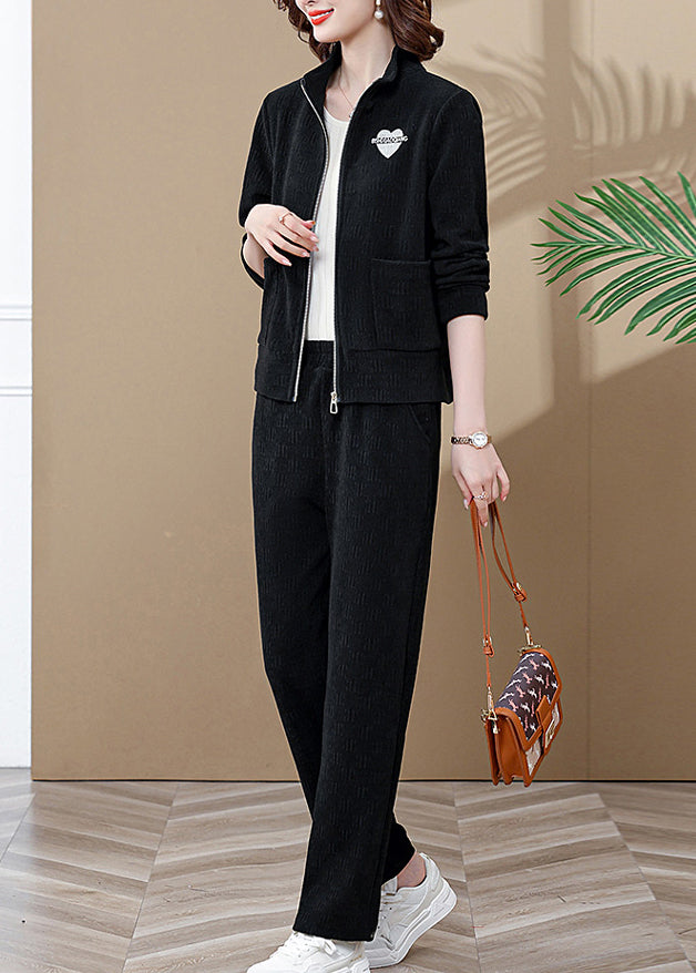 Black Zip Up Coats And Wide Leg Pants Two Piece Set Long Sleeve