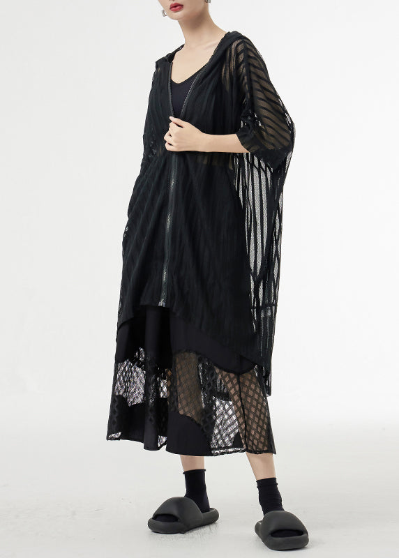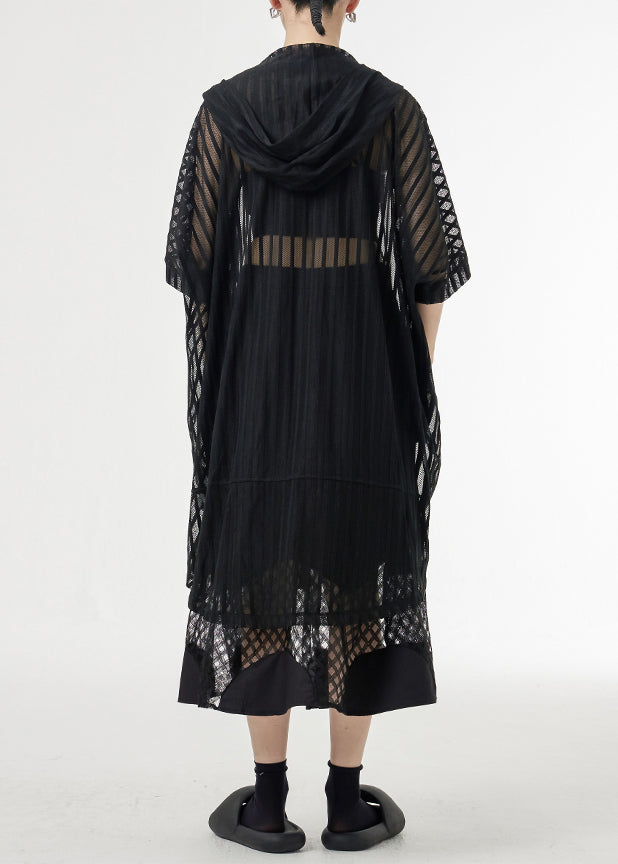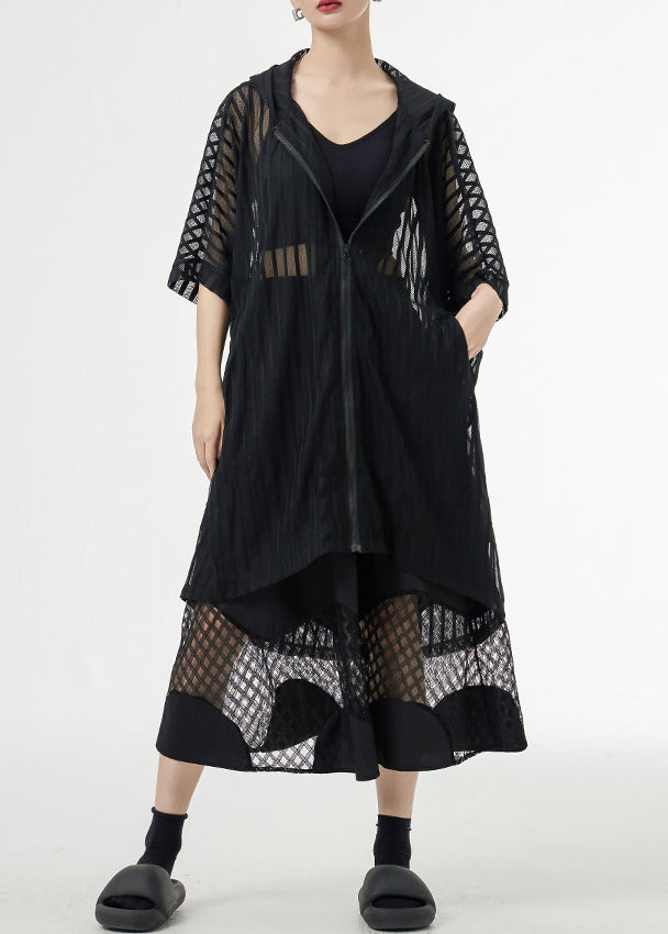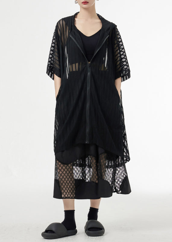 Black Zippered Pockets Patchwork Tulle UPF 50+ Coat Hooded Summer