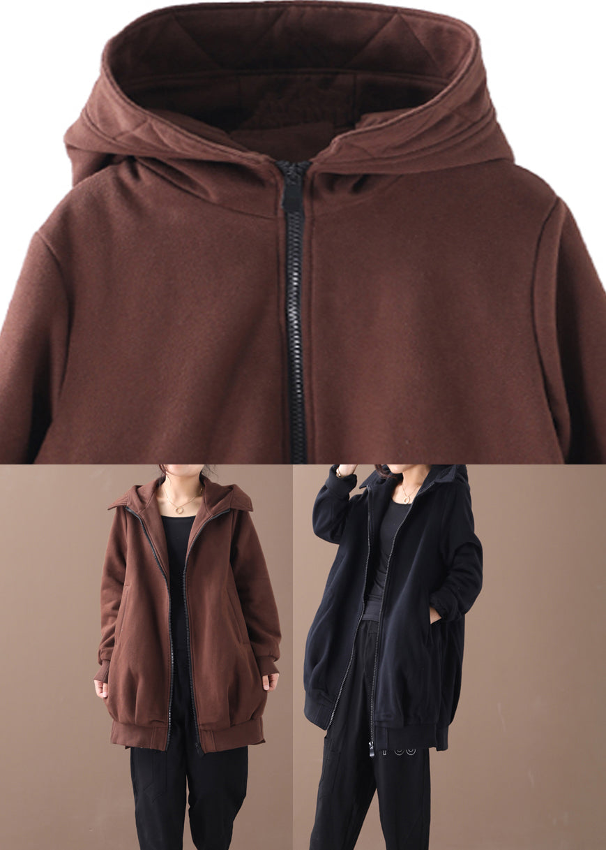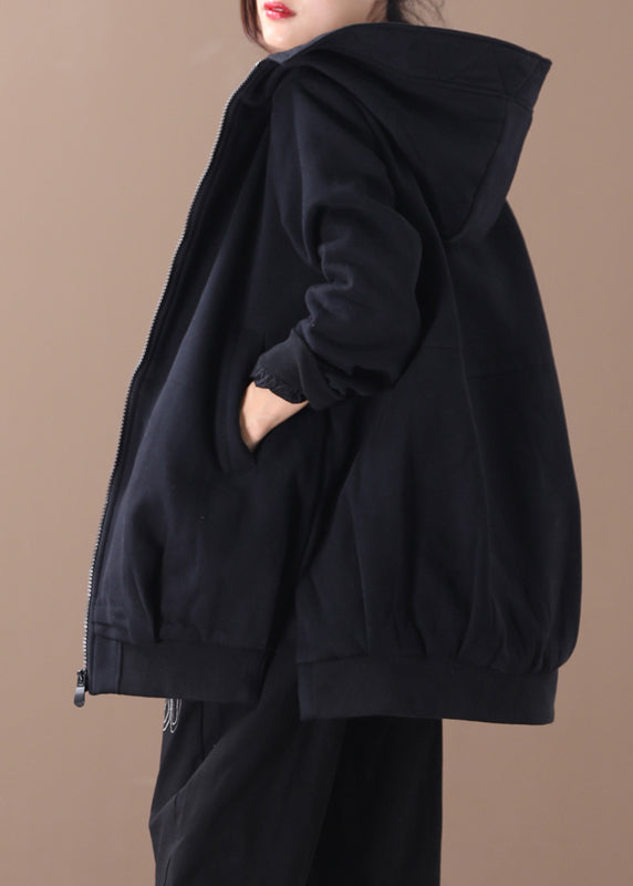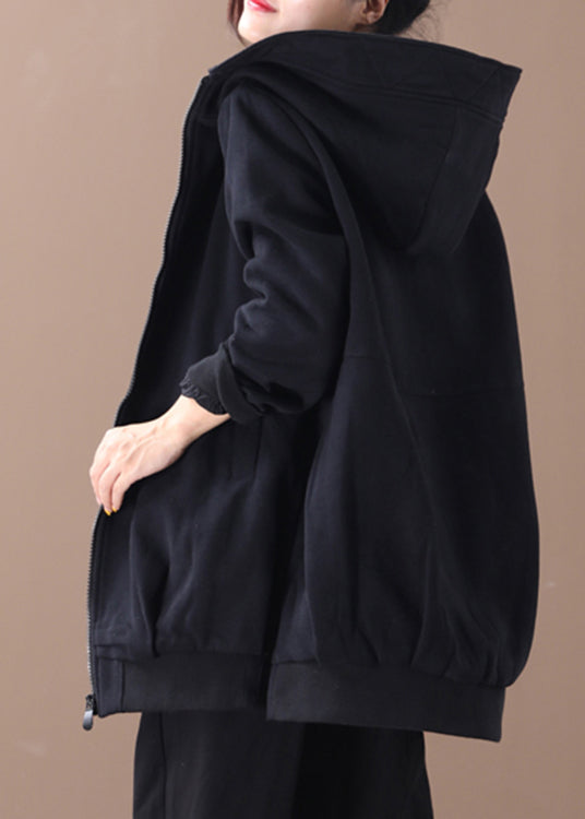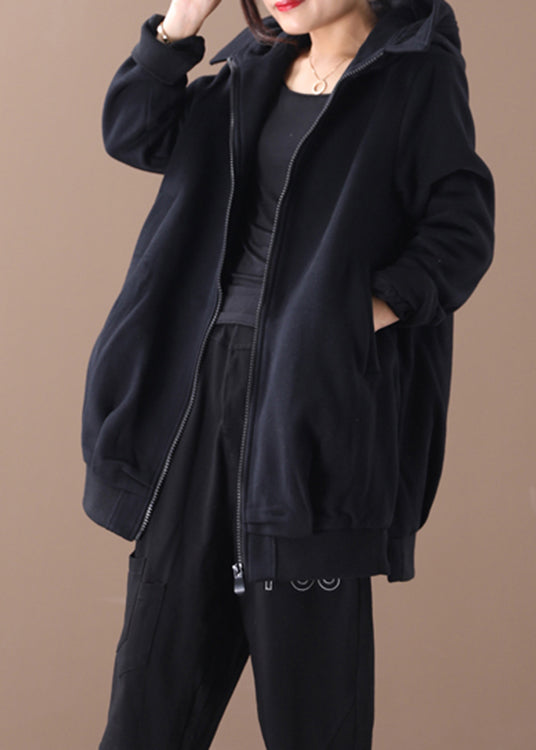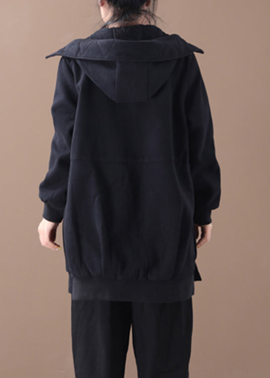 Black Zippered Side Open Hooded Coats Long Sleeve