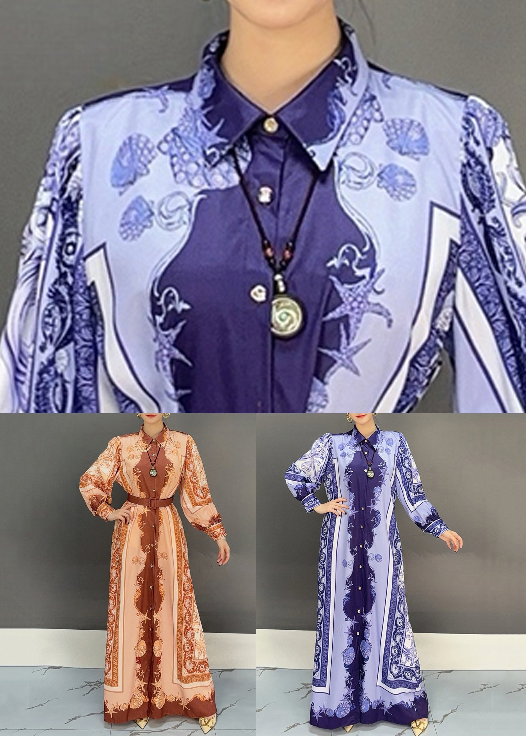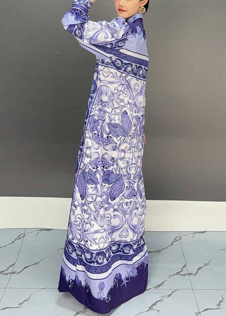 Blue Button High Waist Cotton Fall Long Dress Peter Pan Collar