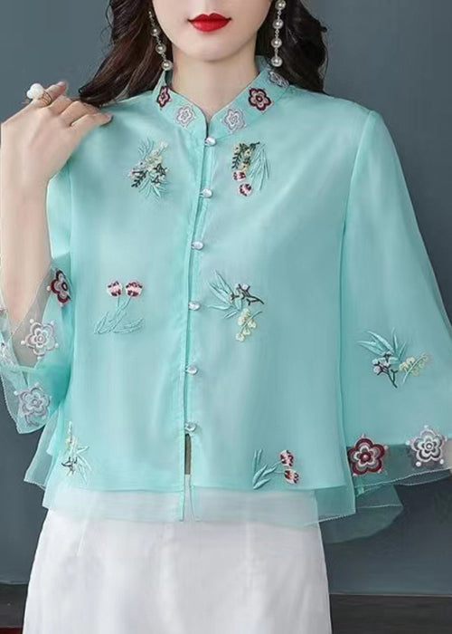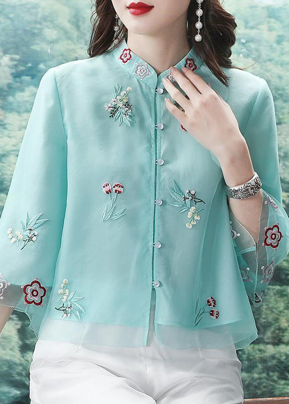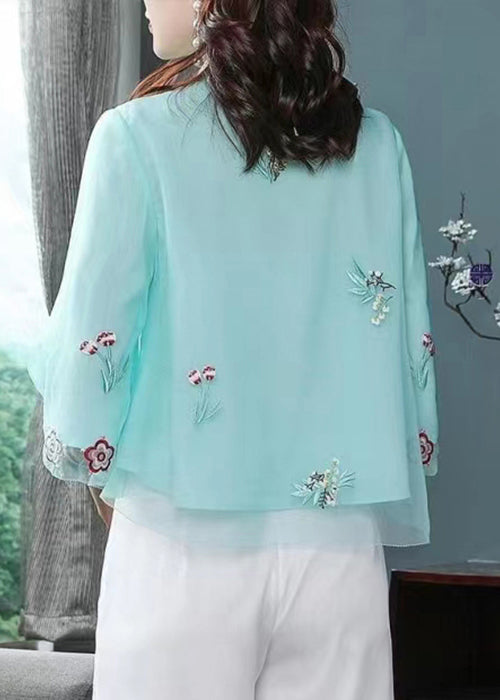 Blue Button Patchwork Shirt Top Embroideried Half Sleeve