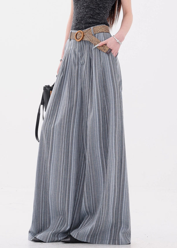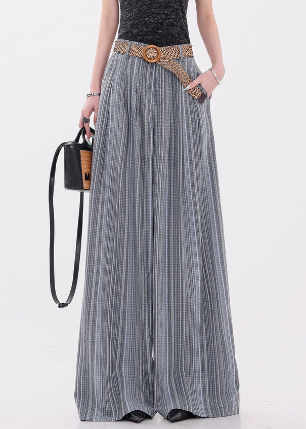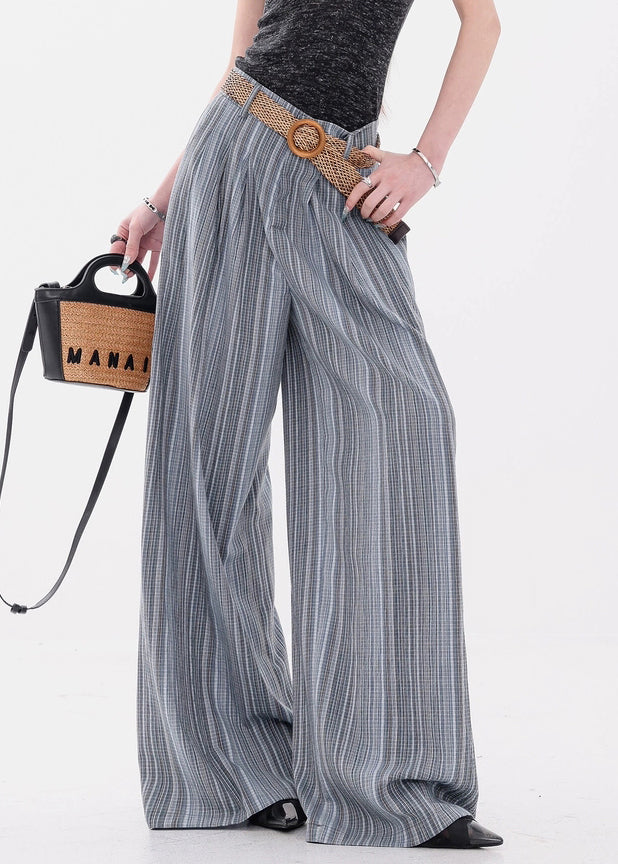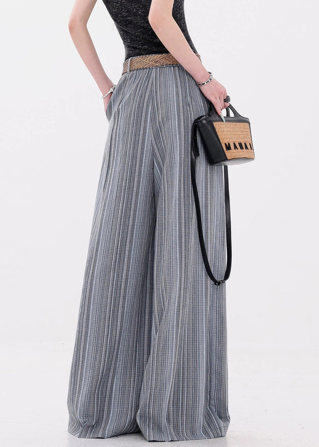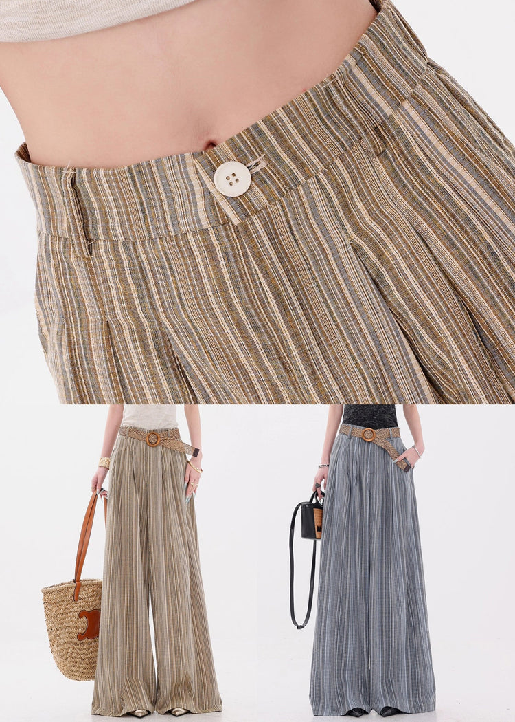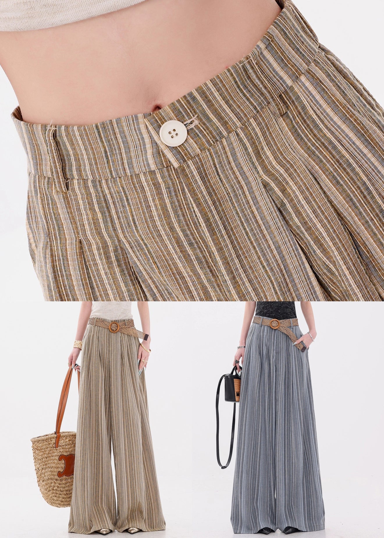 Blue Button Pockets Cotton Wide Leg Pants Elastic Waist
