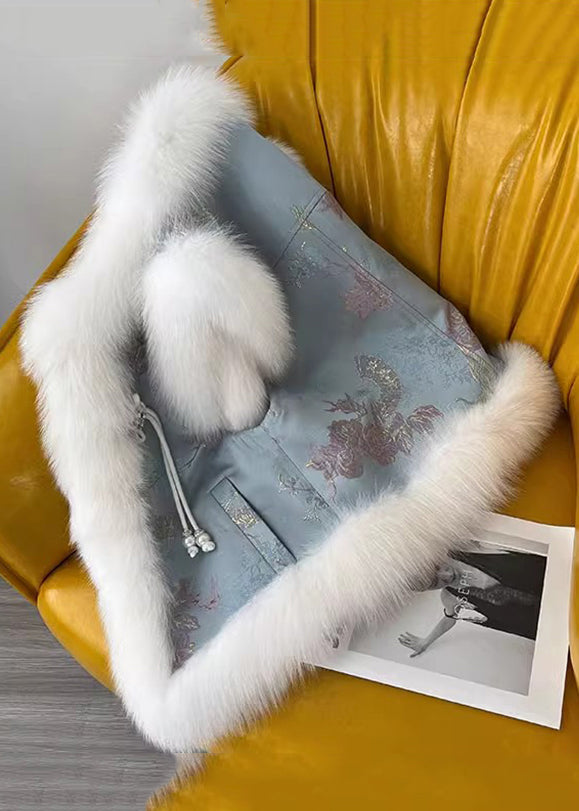 Blue Chinese Button Patchwork Cotton Filled Waistcoat Fur Collar Winter