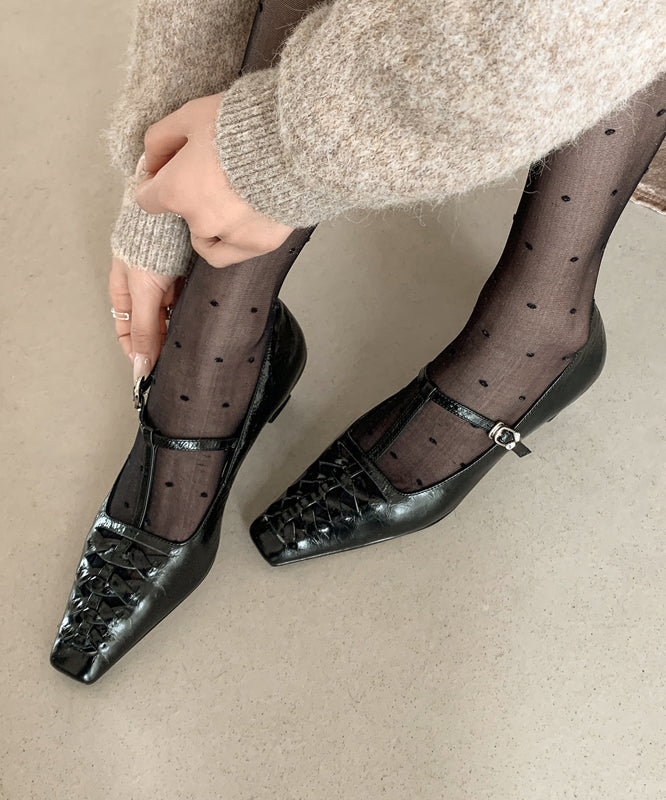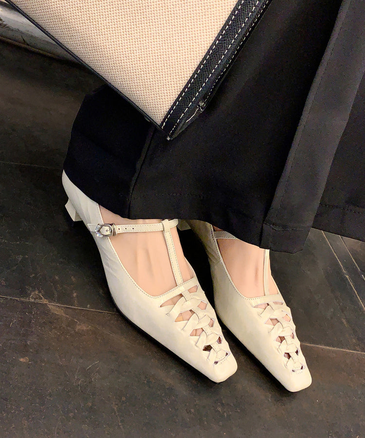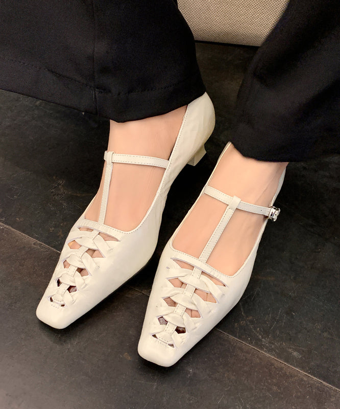 Blue Chunky Heel Cowhide Leather French Splicing Hollow Out