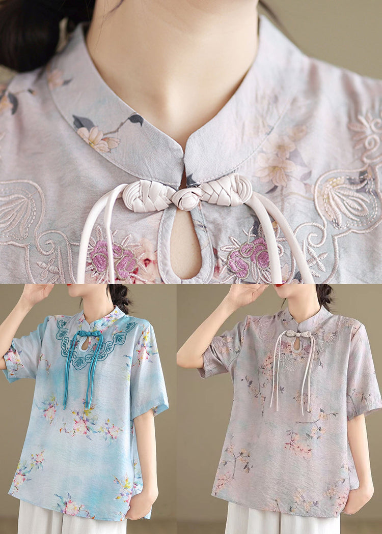 Blue Cotton Shirt Tasseled Stand Collar Embroidered Summer