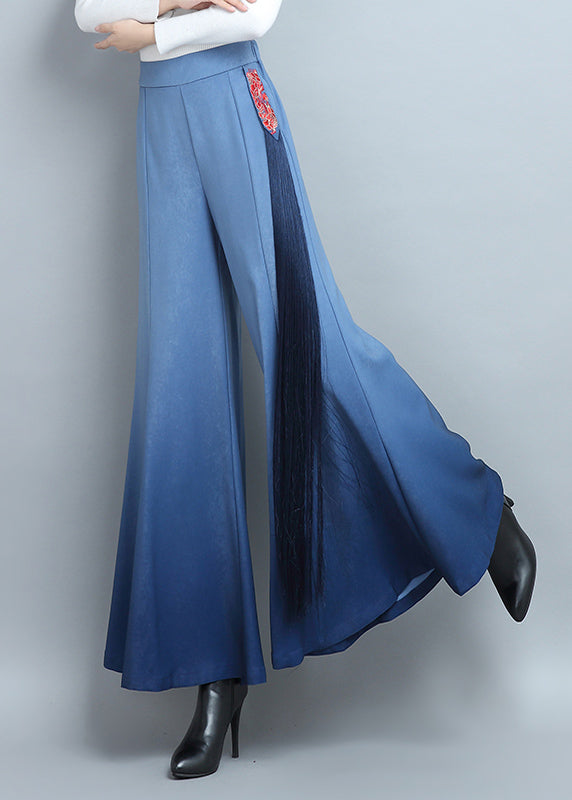 Blue Elastic Waist Cotton Wide Leg Pants Tasseled Spring