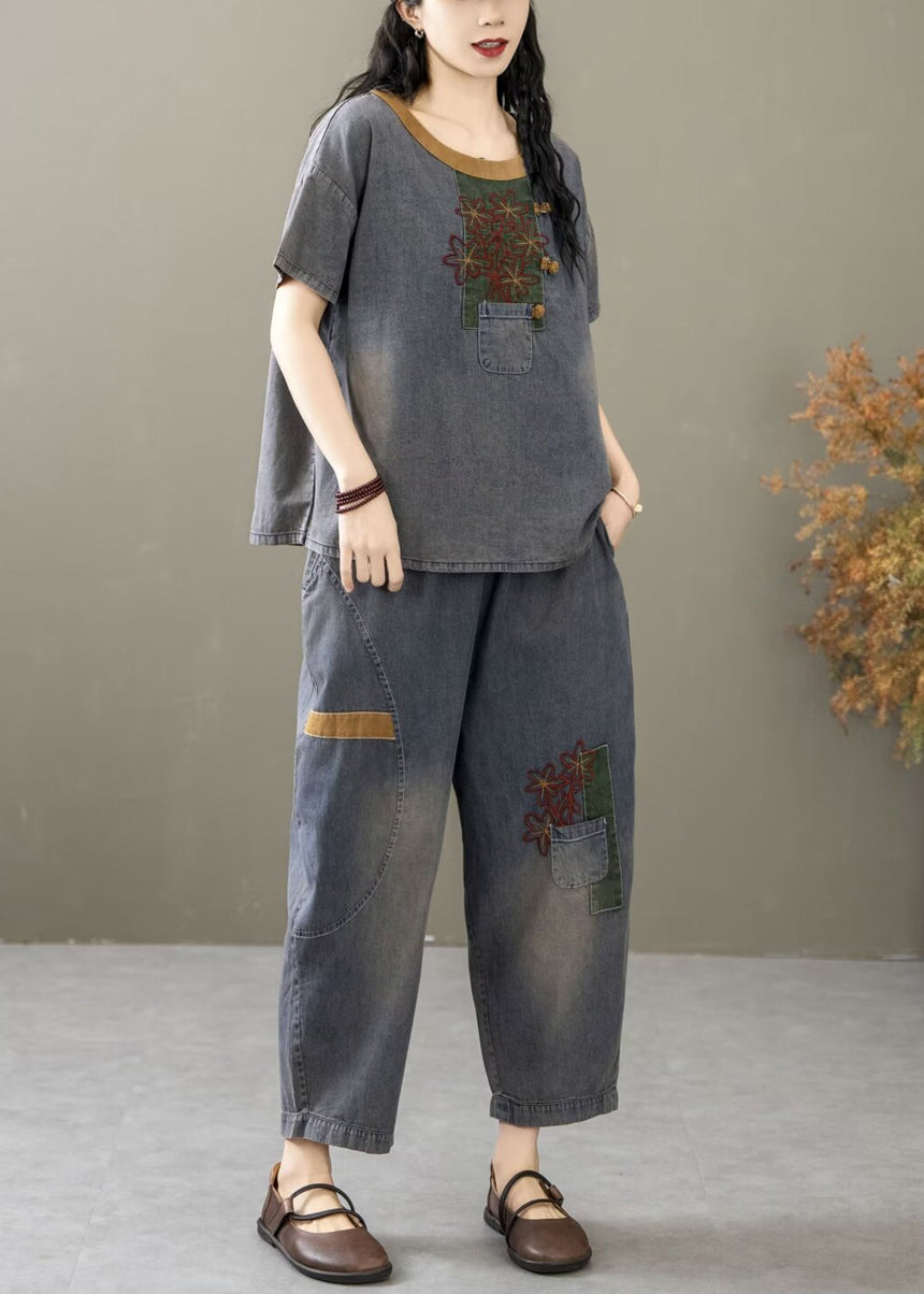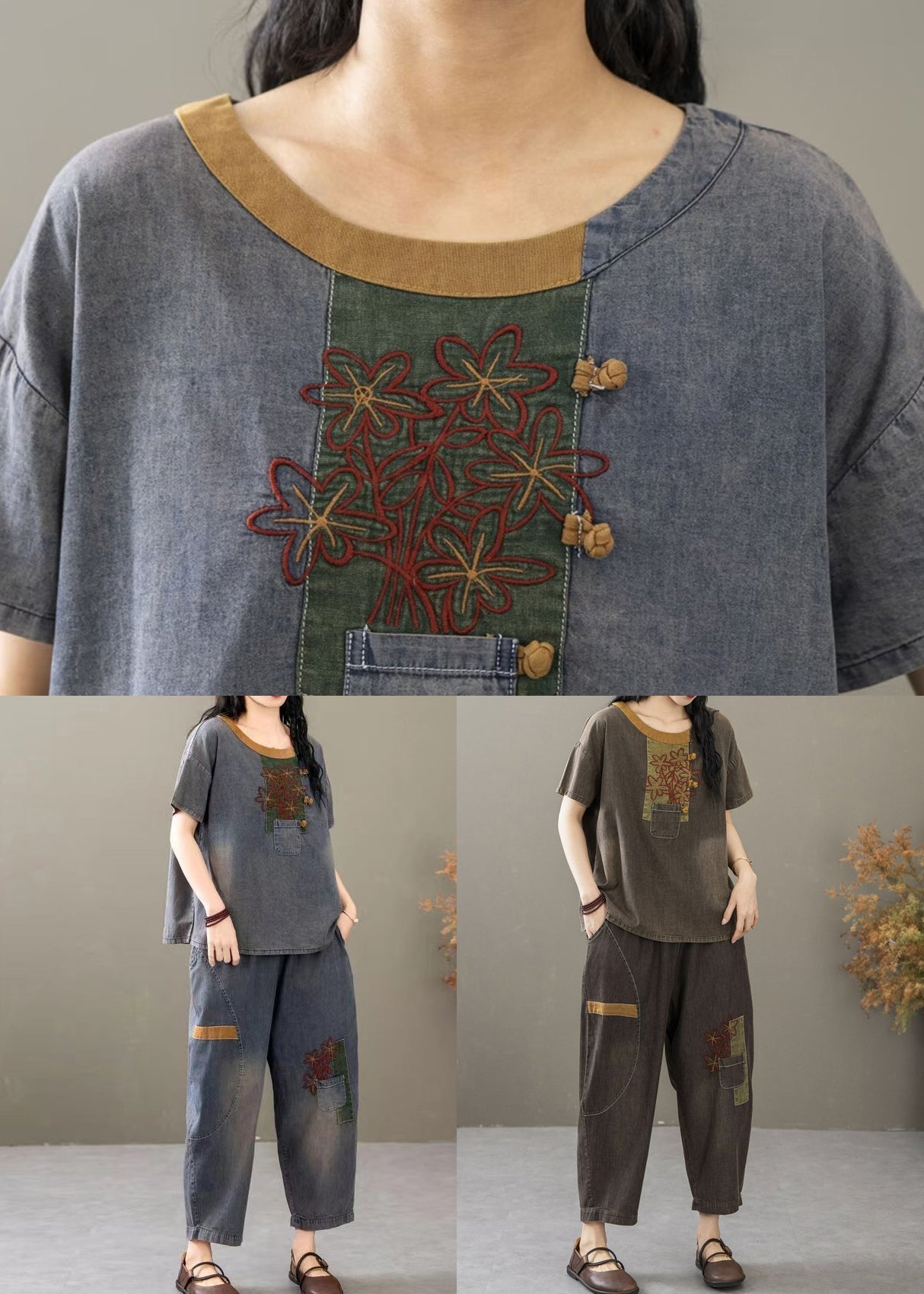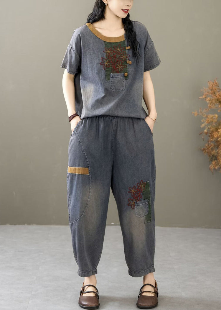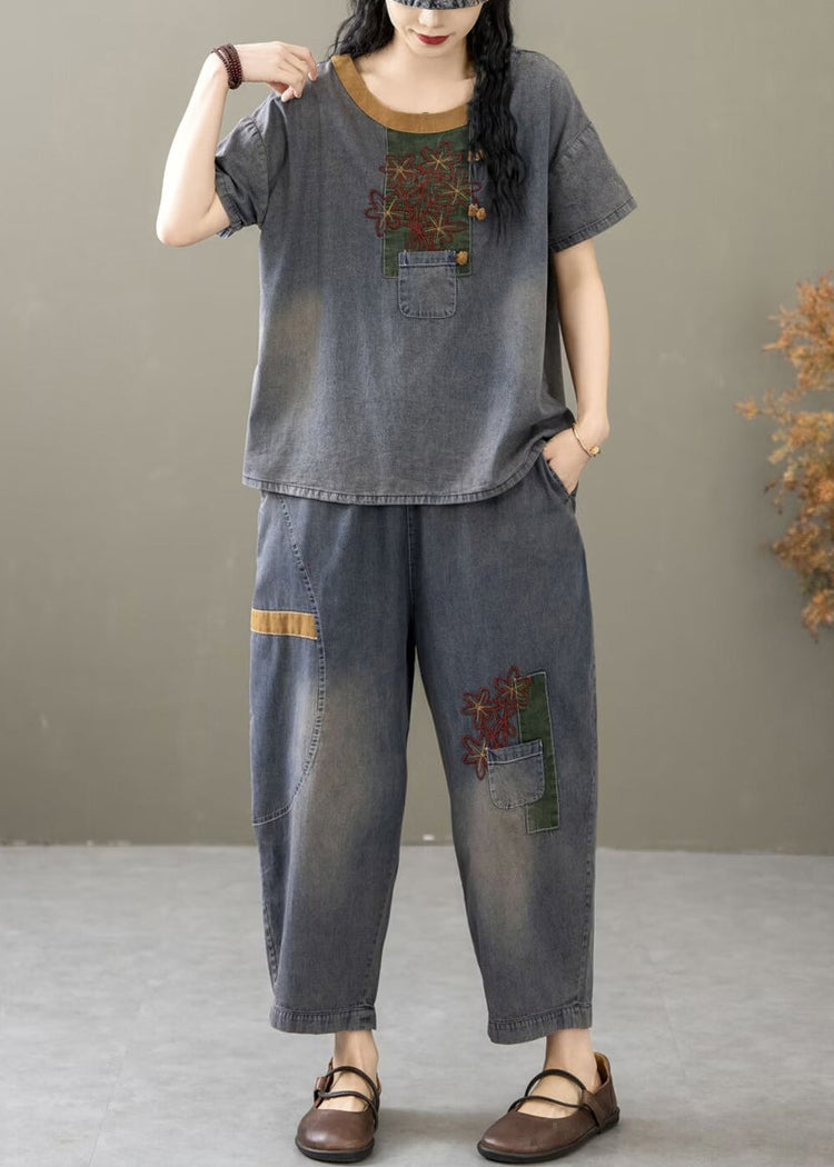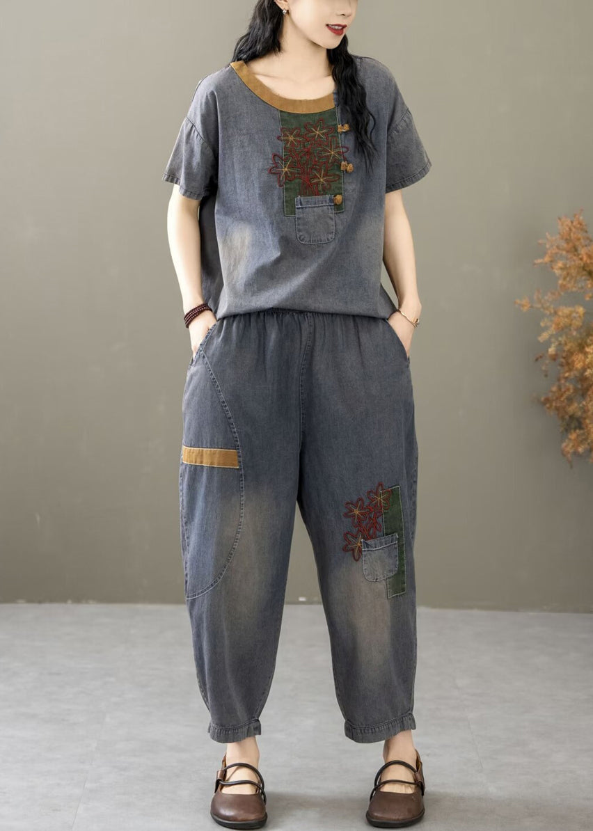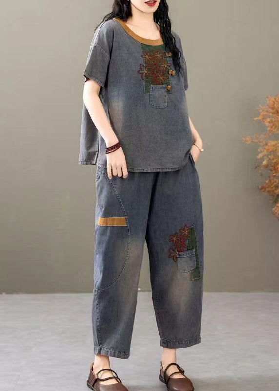 Blue Elastic Waist Denim Two Pieces Set O Neck Short Sleeve