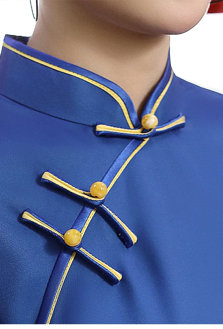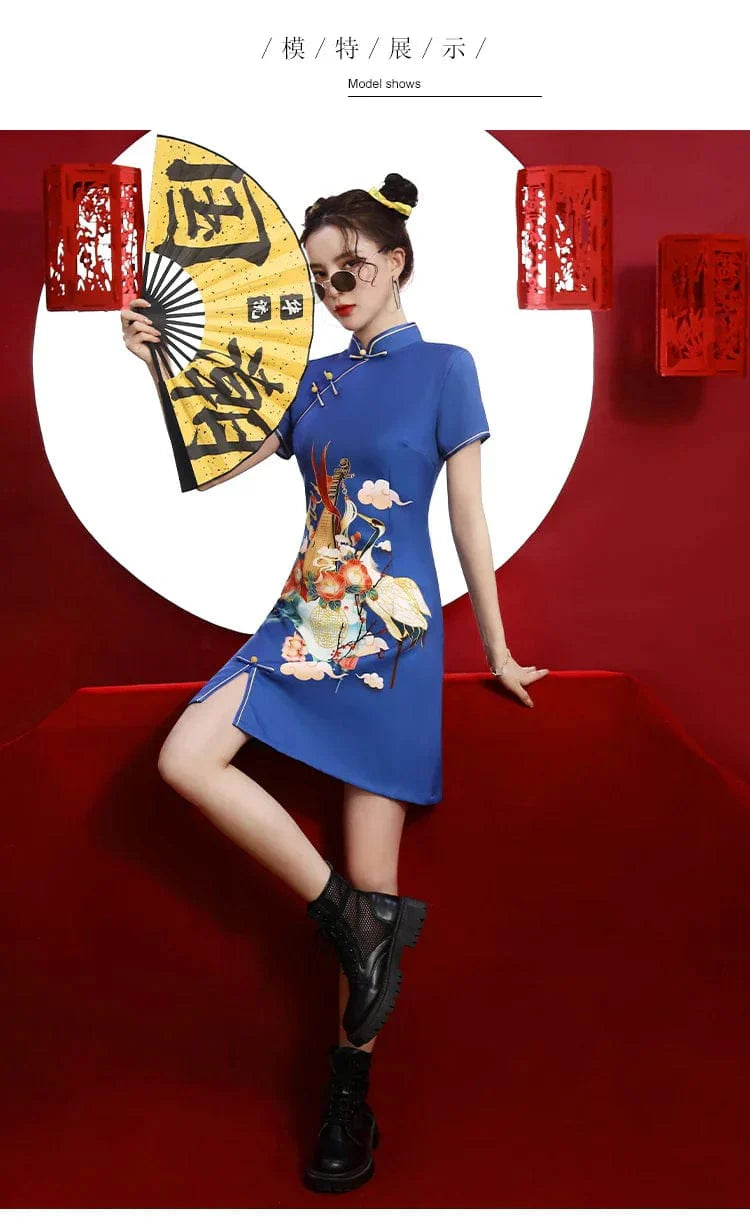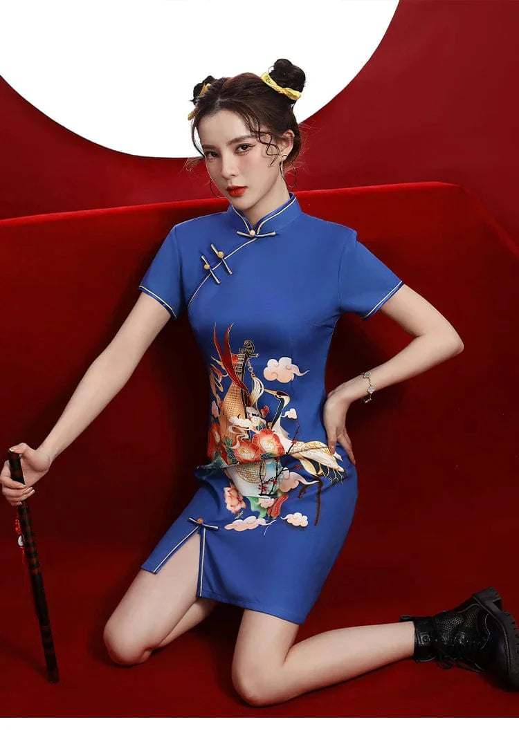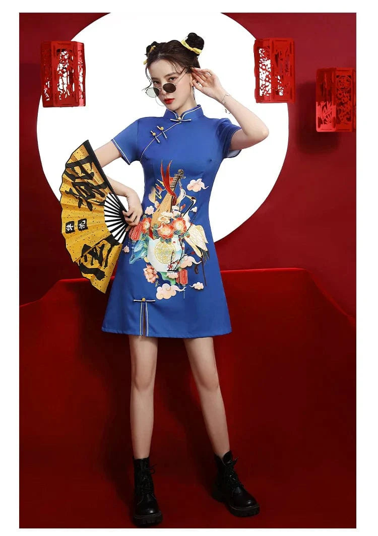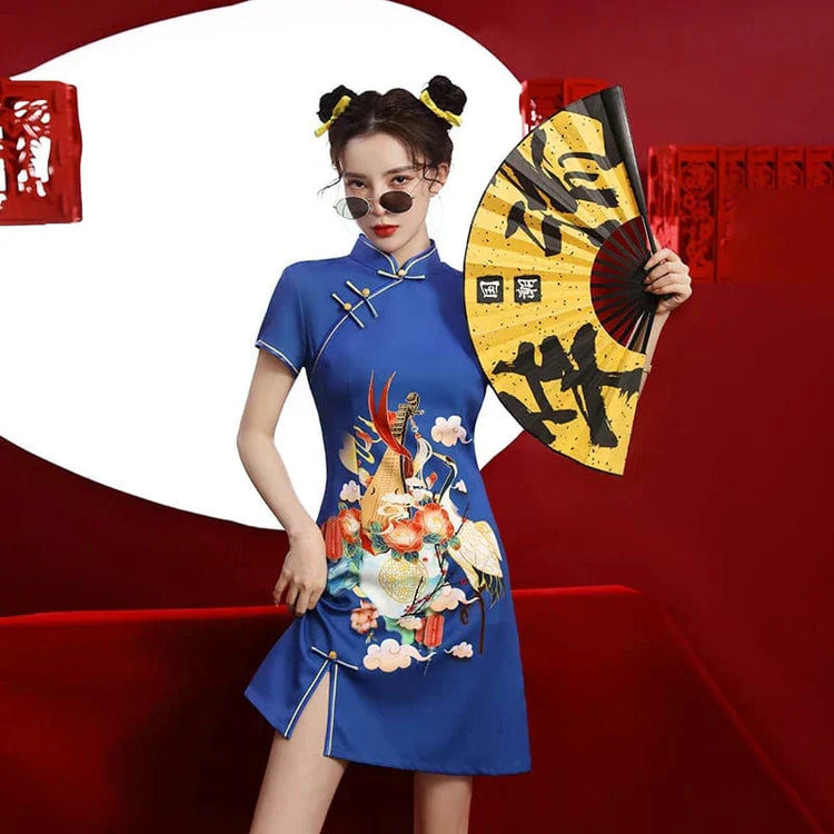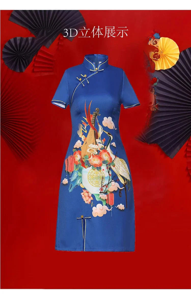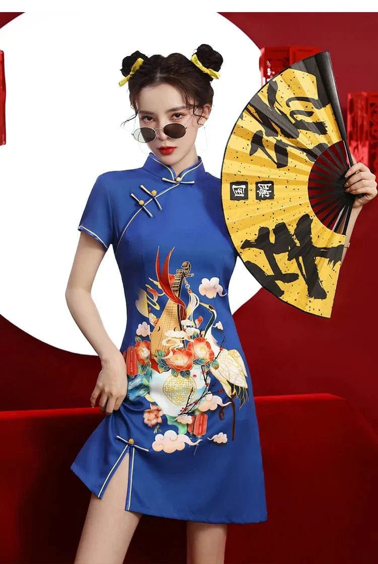 Blue Floral Guitar Print Cheongsam Dress Short Sleeve