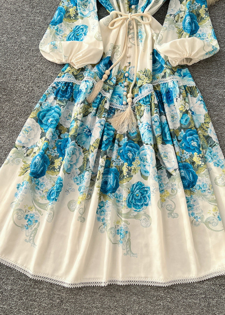 Blue Floral Patchwork Lace Dress Tie Waist Lantern Sleeve