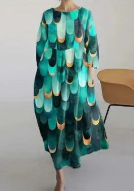 Blue Green Print Cotton Dresses Pockets Patchwork Summer