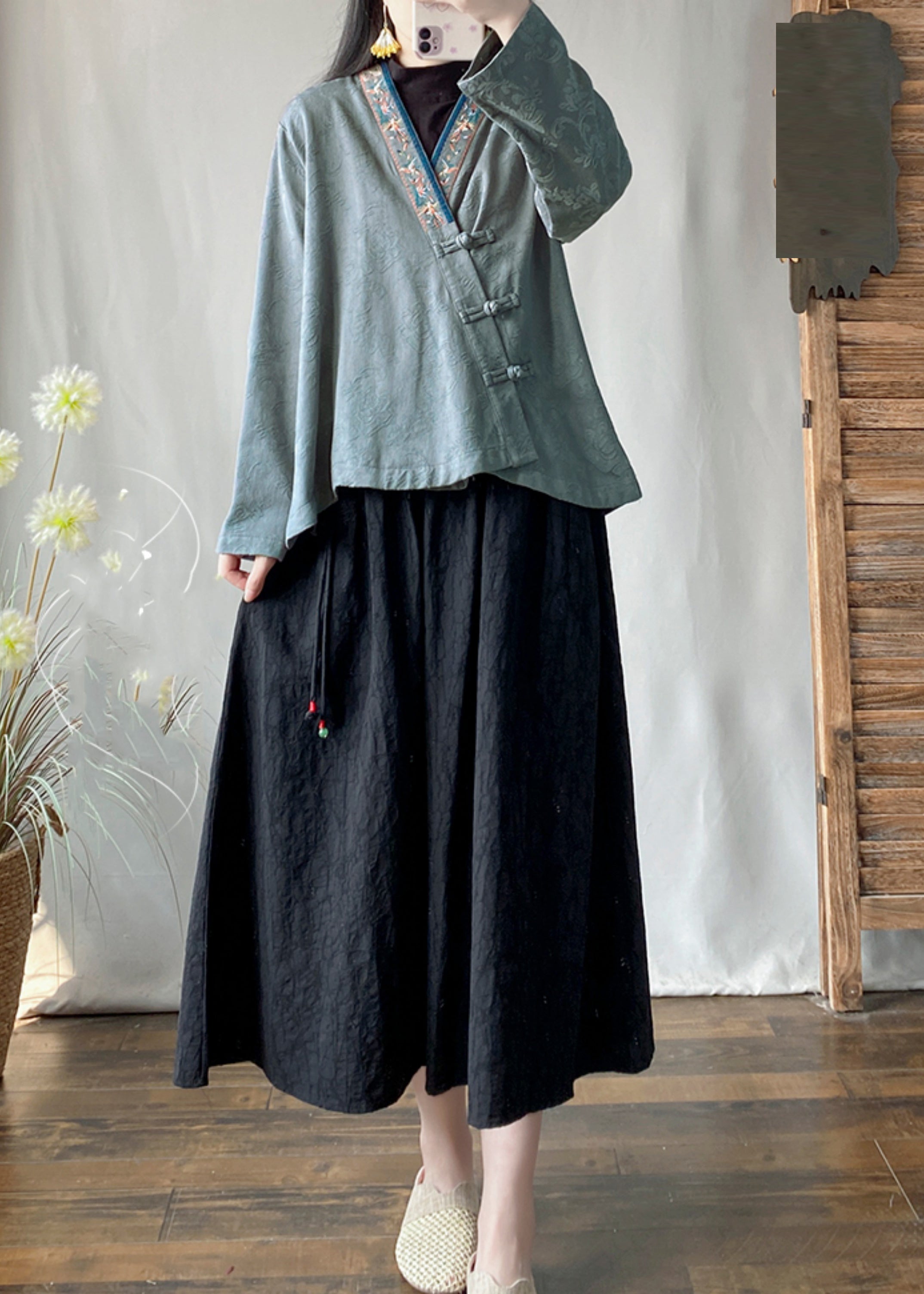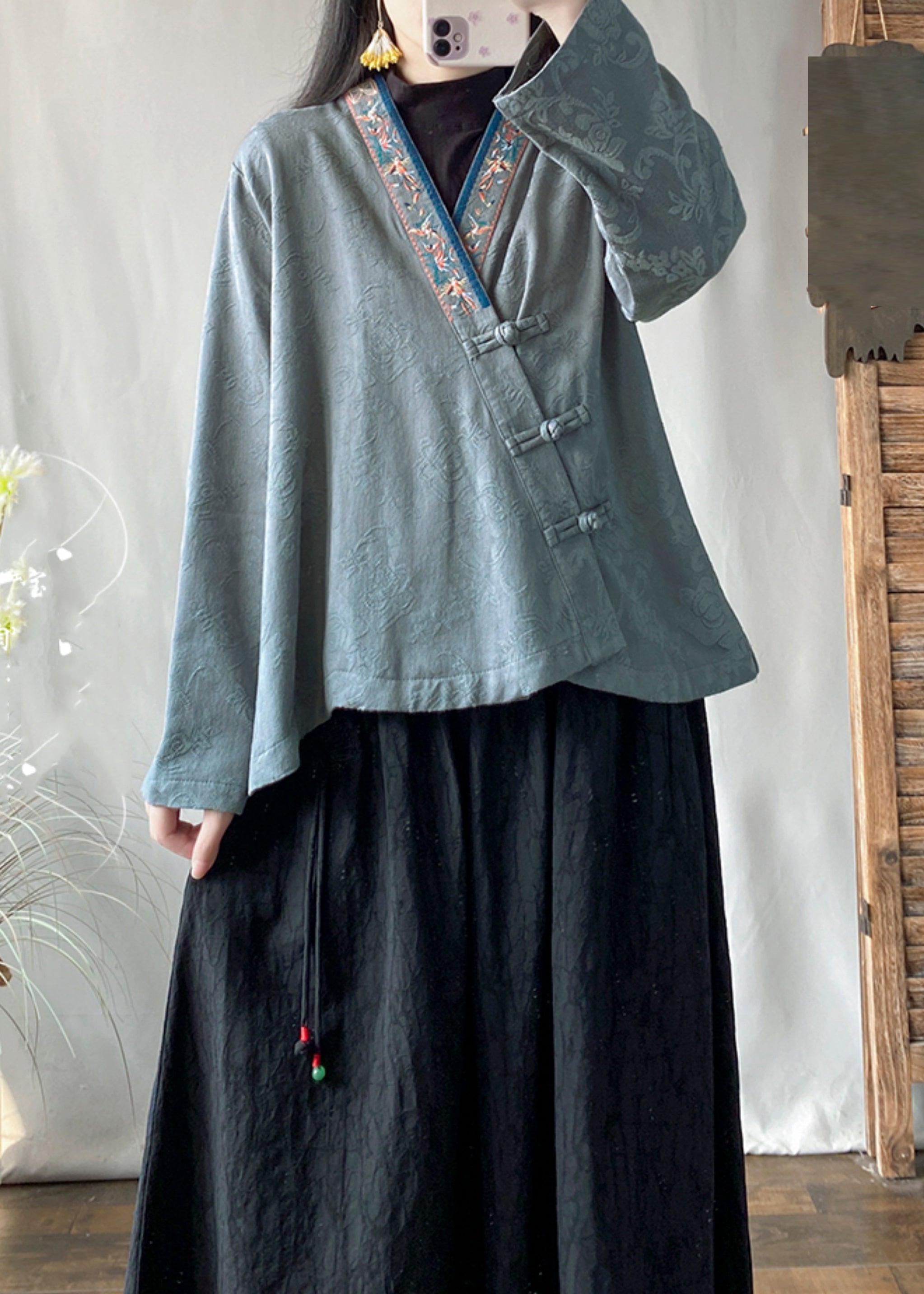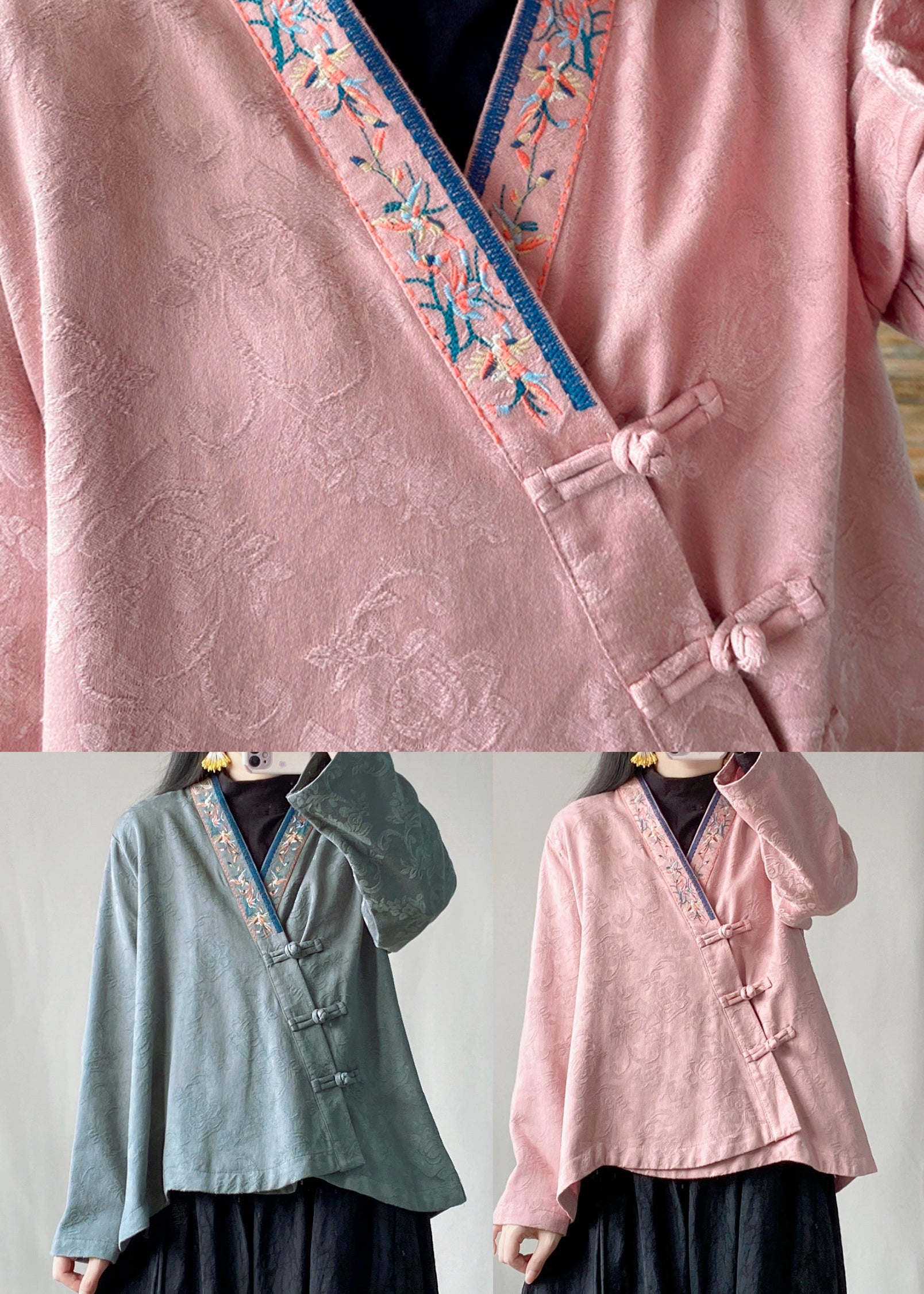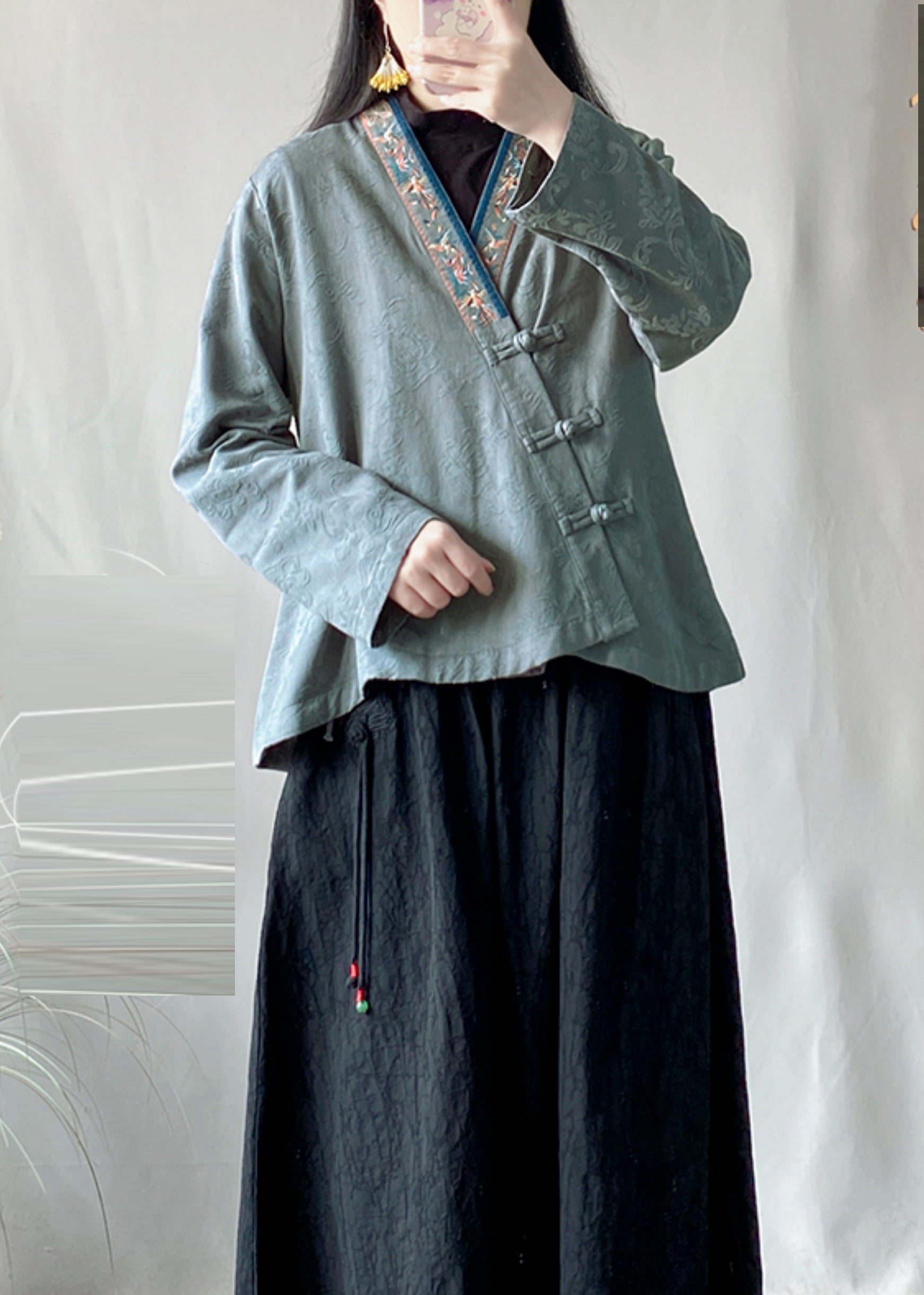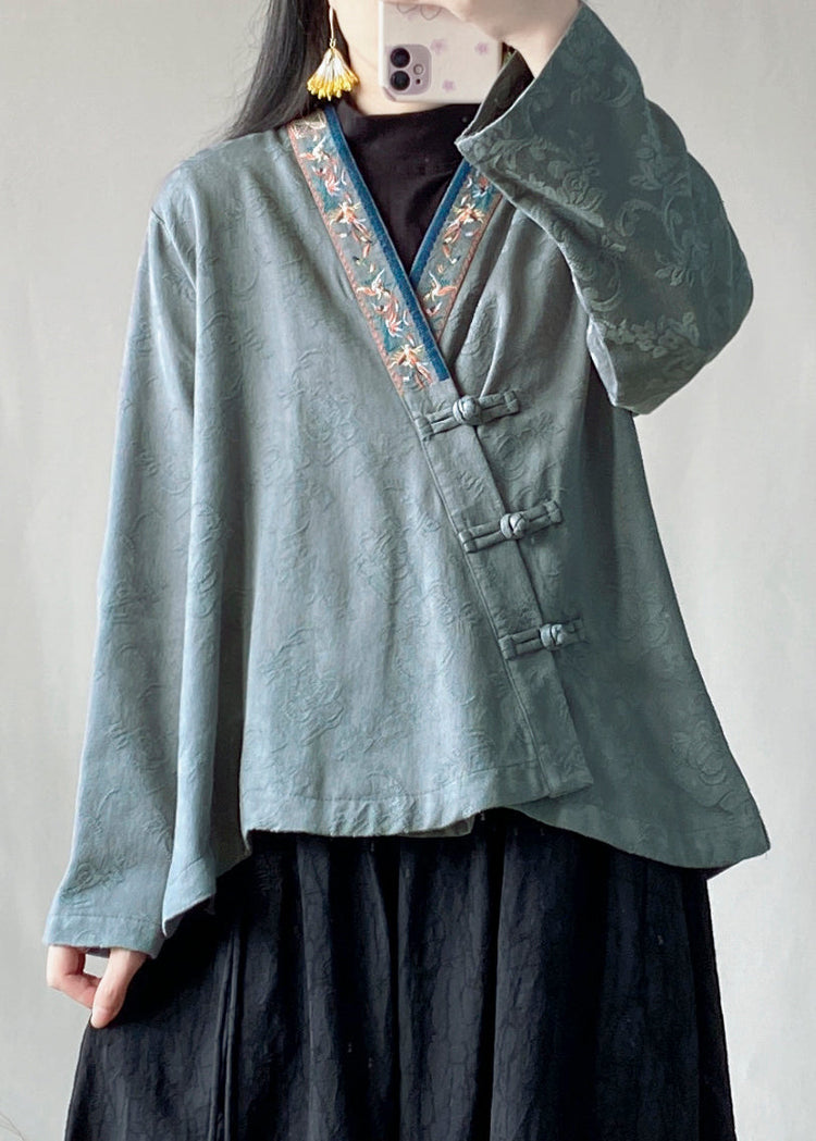 Blue Jacquard Cotton Top Embroidered Chinese Button Spring
