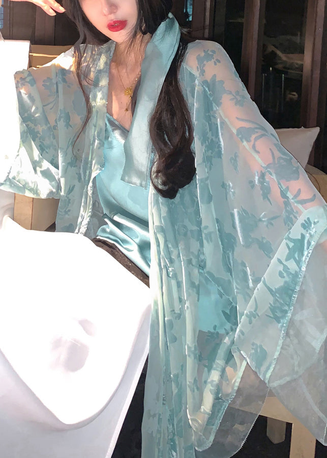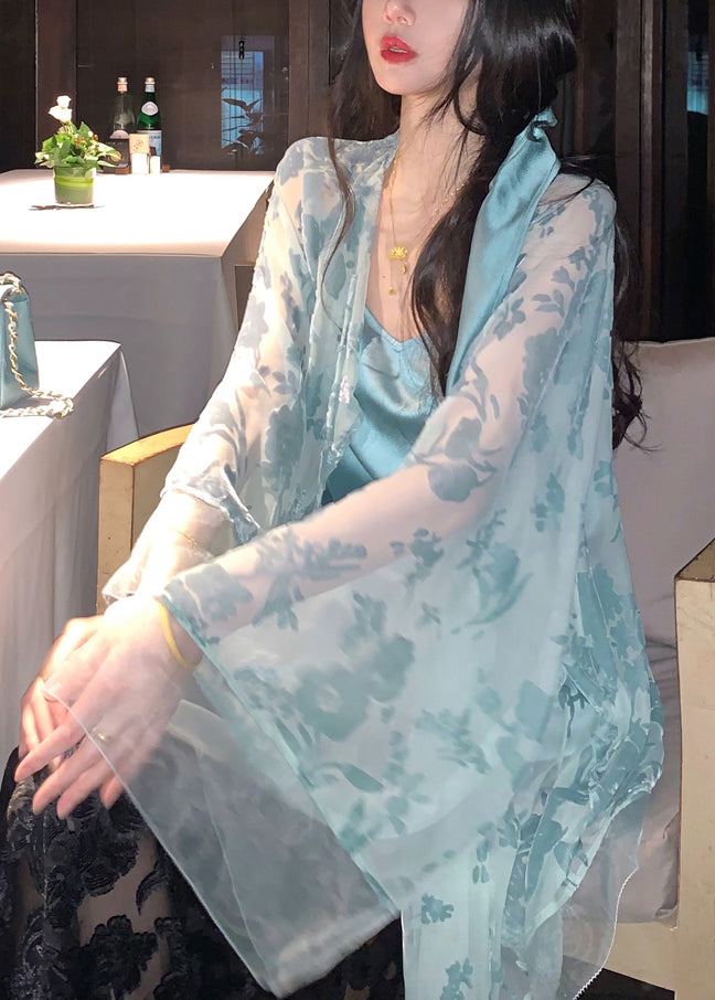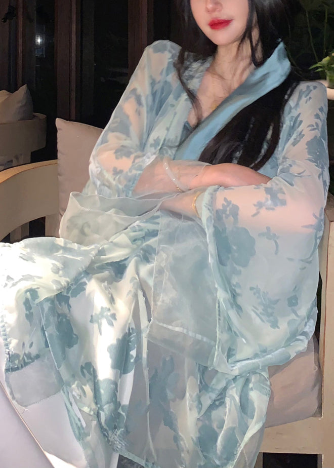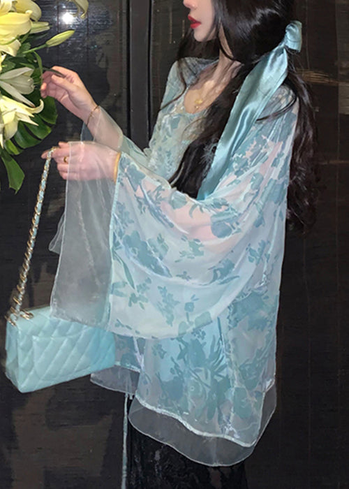Blue Lace Up Silk Velour Shirts V Neck Batwing Sleeve