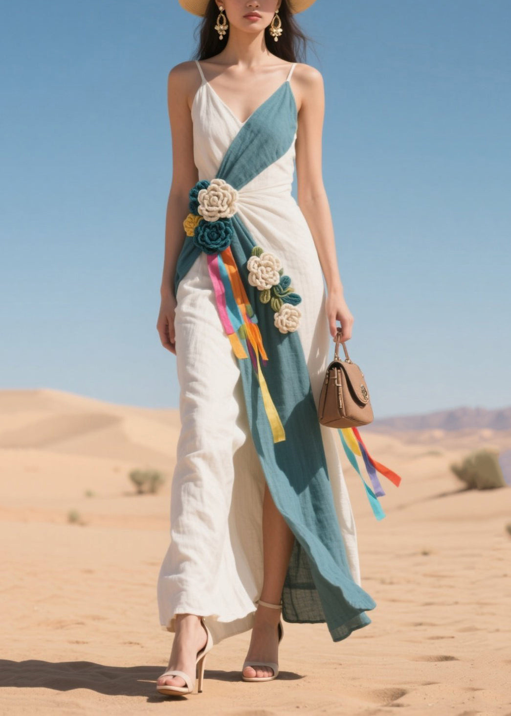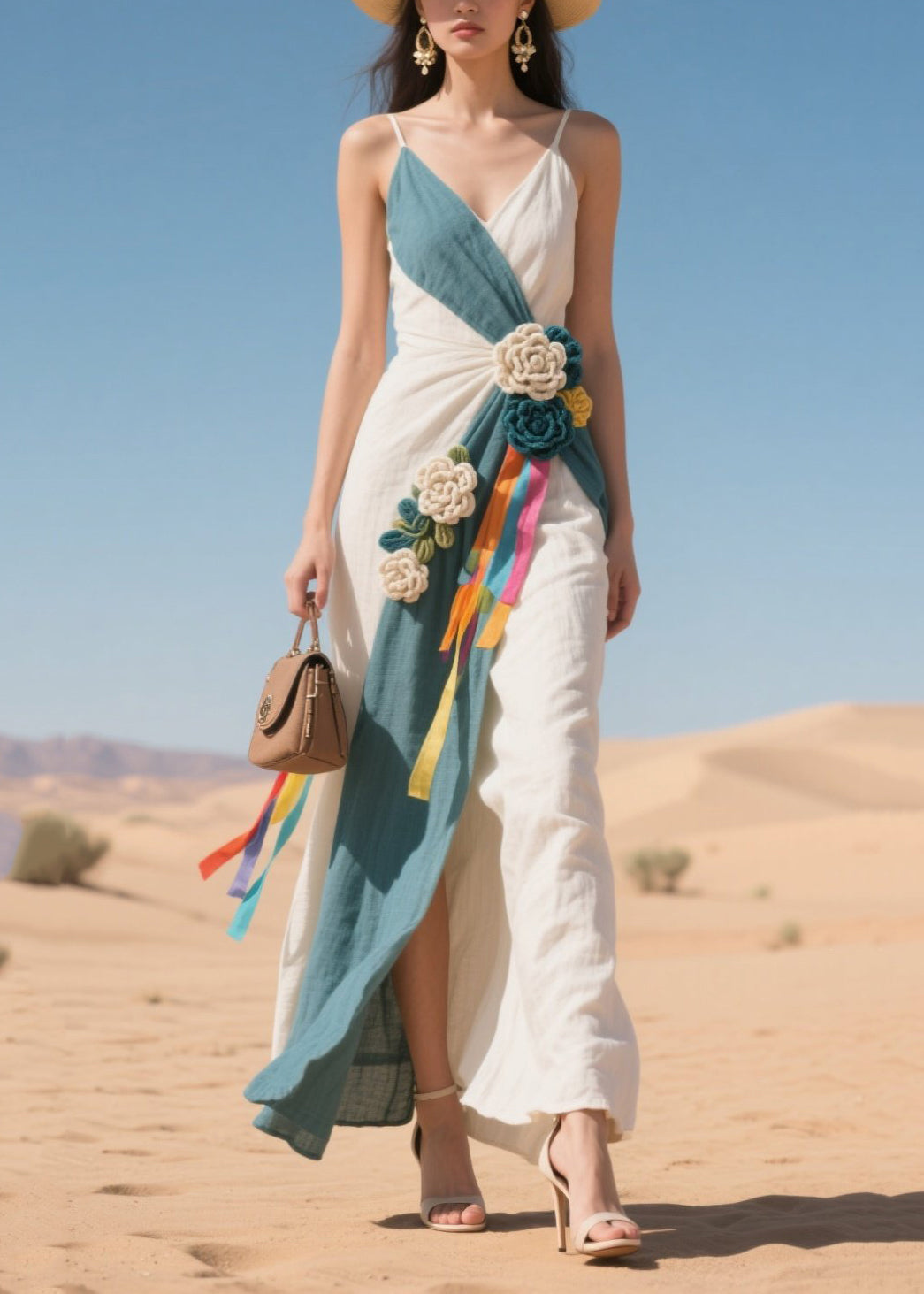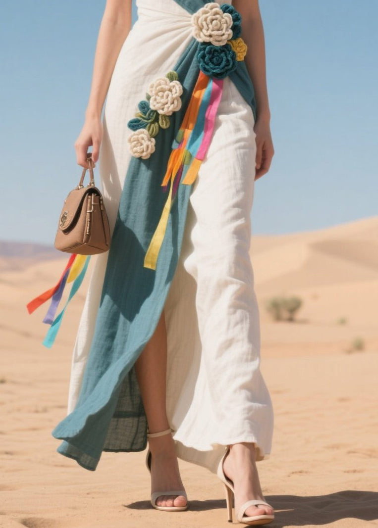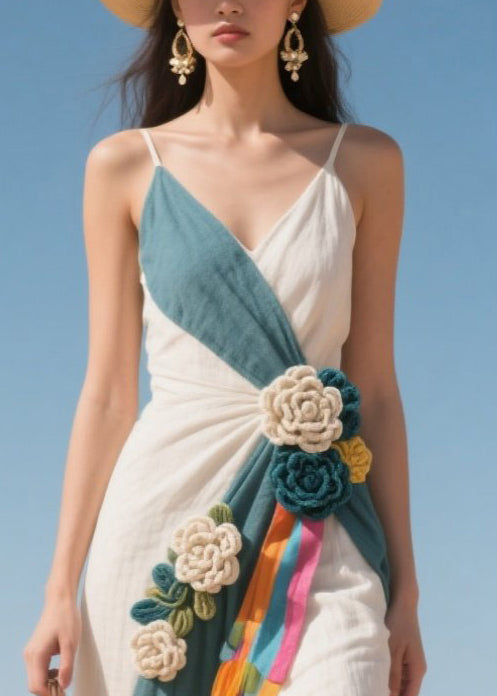 Blue Patchwork Cotton Spaghetti Strap Dress Flower Decorated Summer