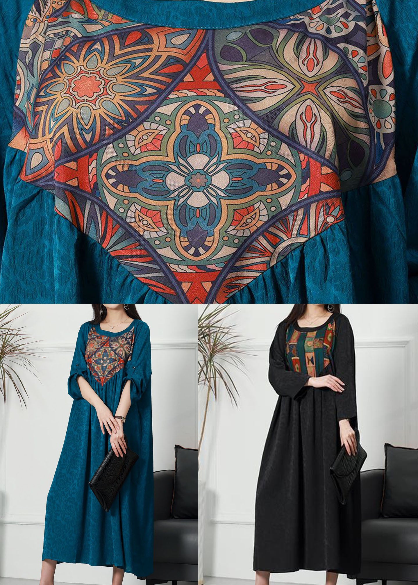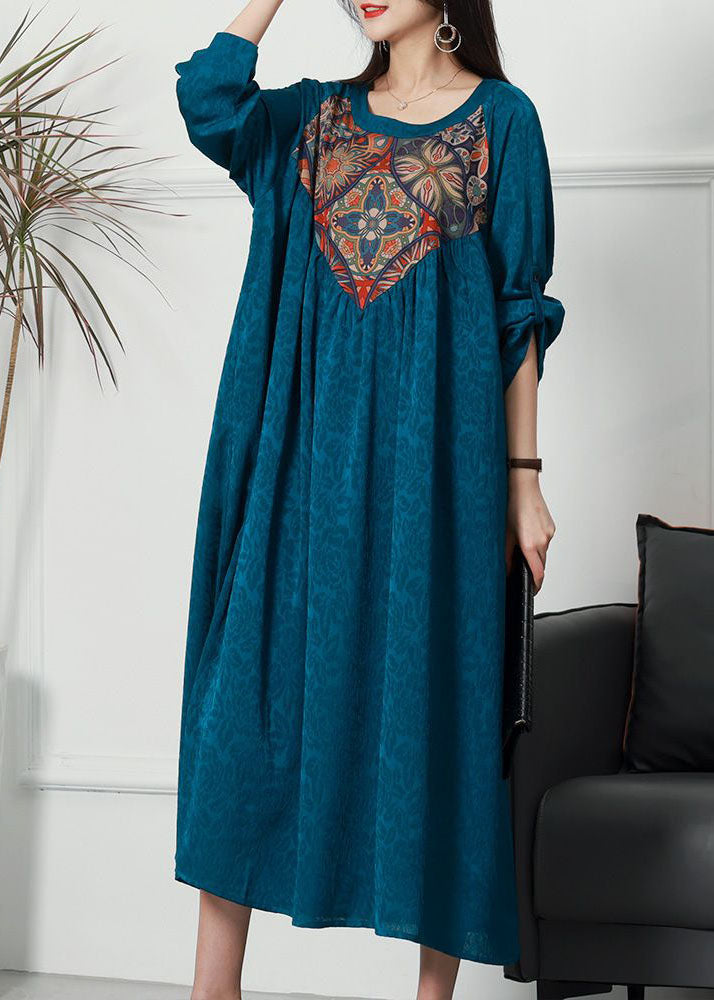 Blue Patchwork Jacquard Silk Dress O Neck Wrinkled Spring