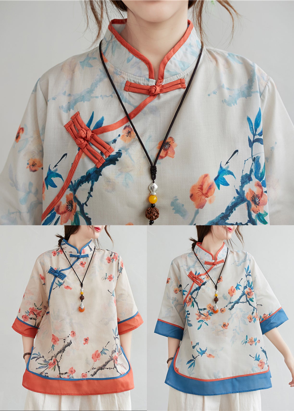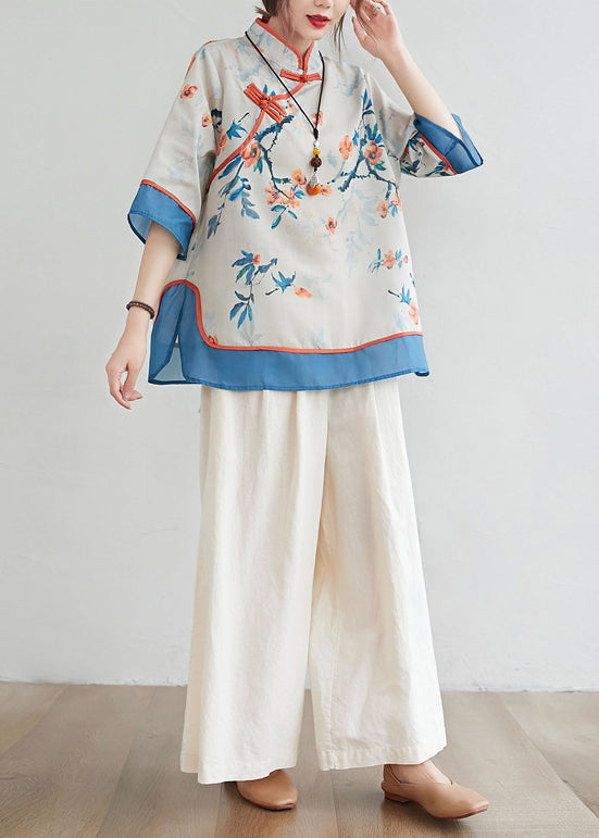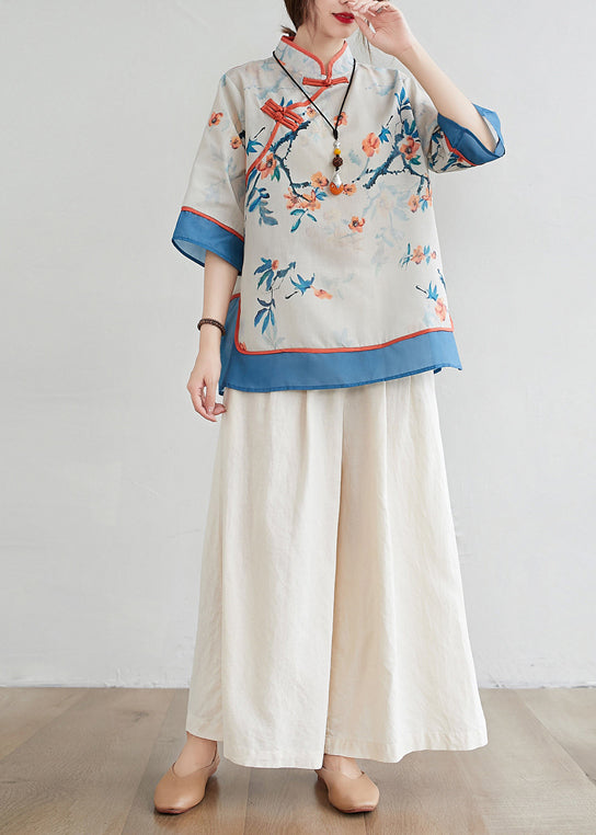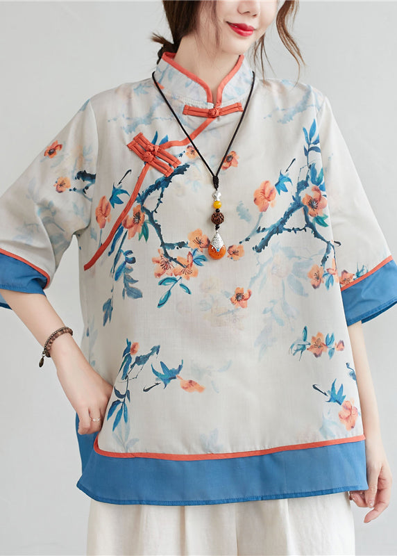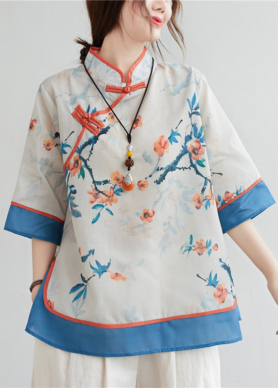 Blue Patchwork Linen Blouses Stand Collar Oriental Button Summer