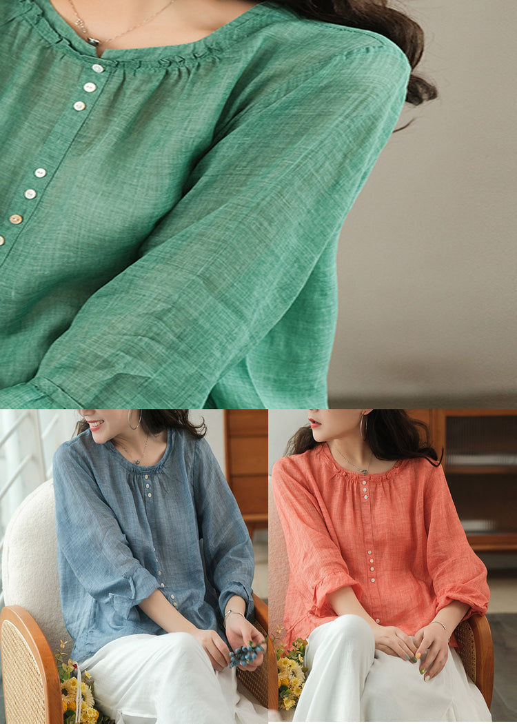Blue Solid Linen Shirt Top Button Ruffled Long Sleeve