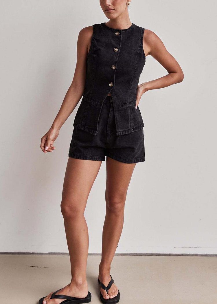 Bohemian Black O-Neck Side Open Denim Two Pieces Set Sleeveless