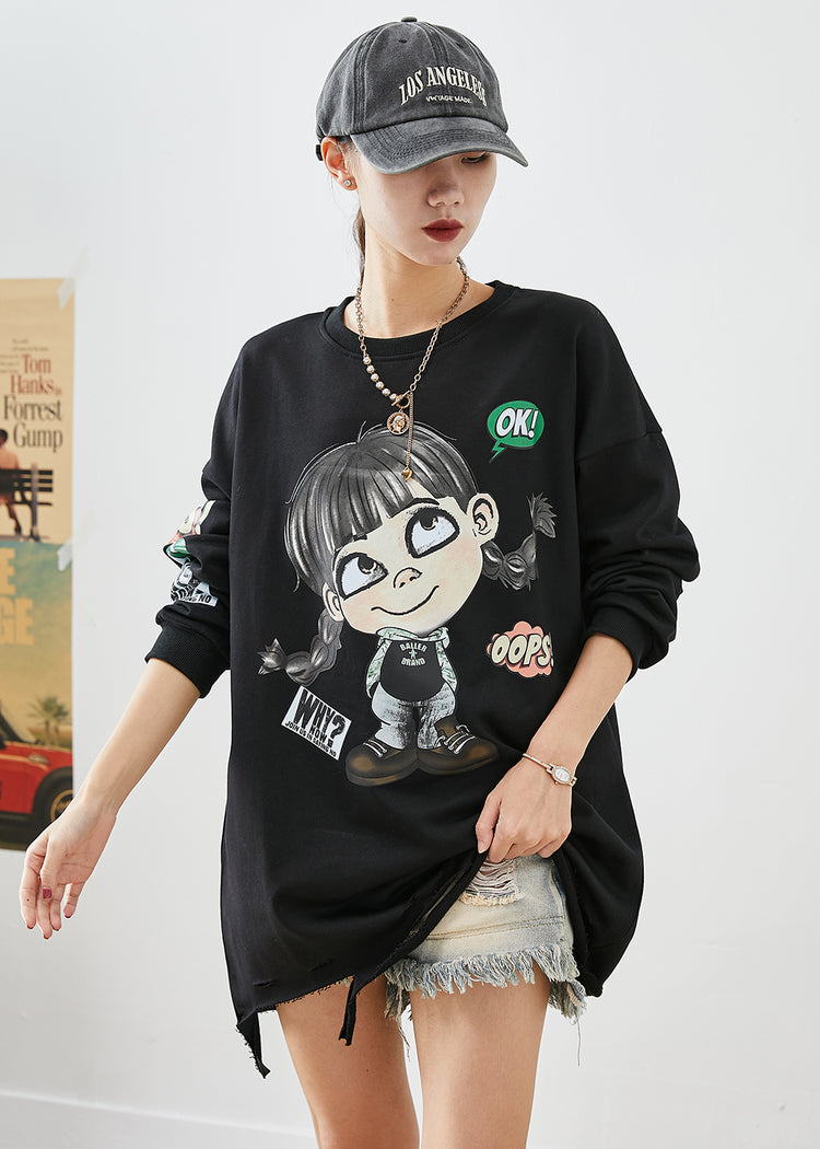Bohemian Black Oversized Cartoon Print Cotton Ripped Sweatshirts Top Fall