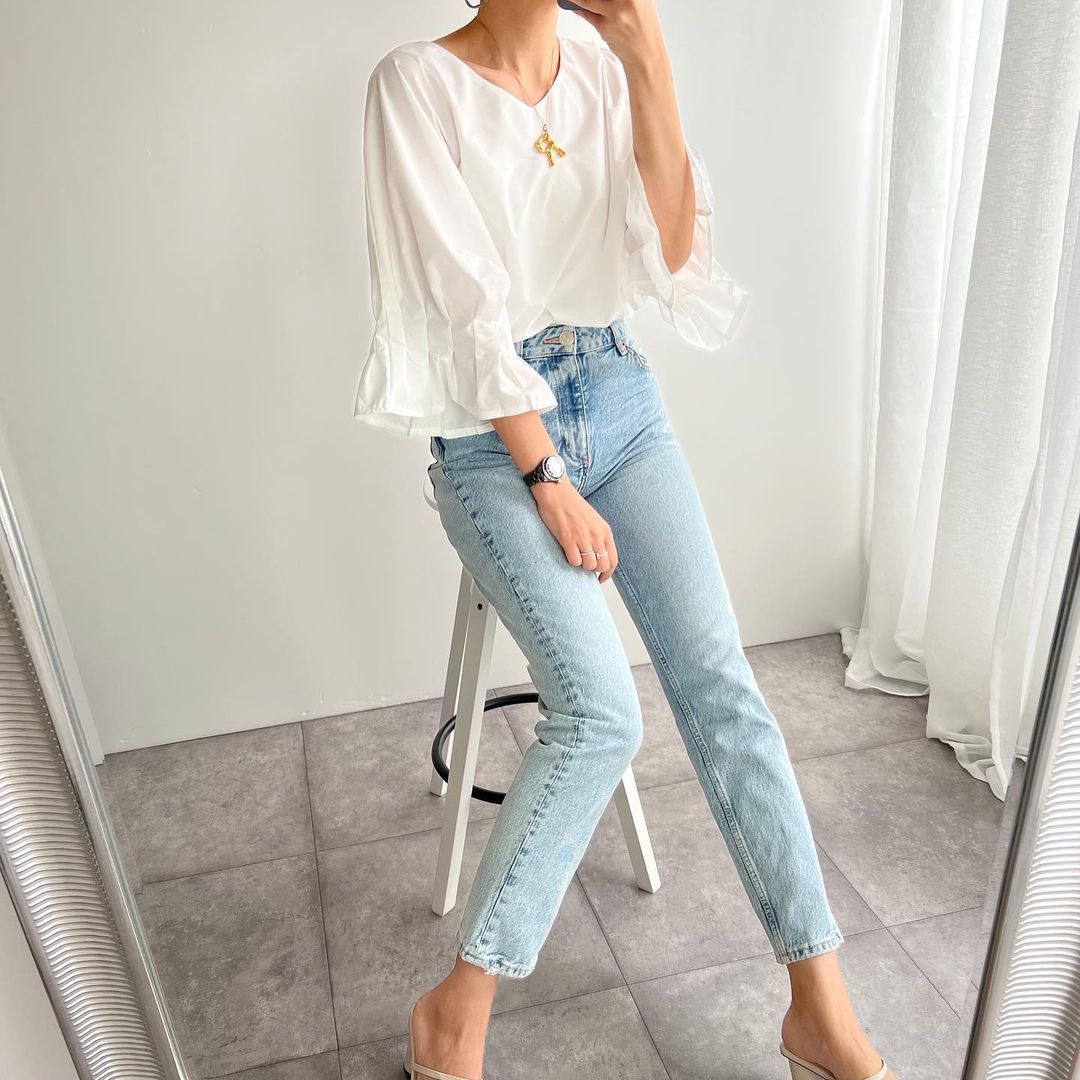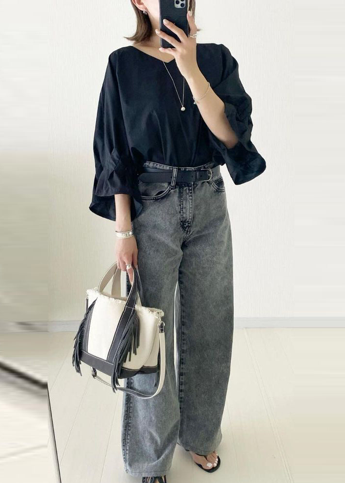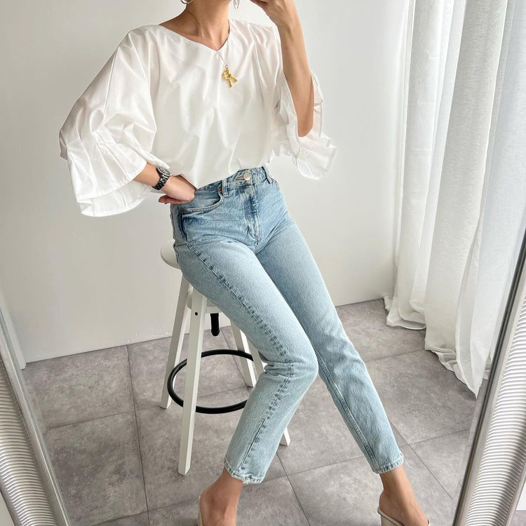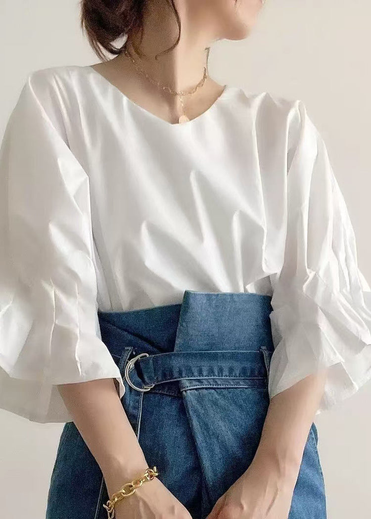 French White Oversized Cotton Shirt Top Lantern Sleeve