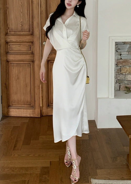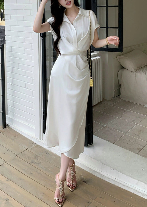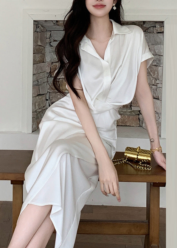 French White Peter Pan Collar Side Open Silk Long Dresses Summer