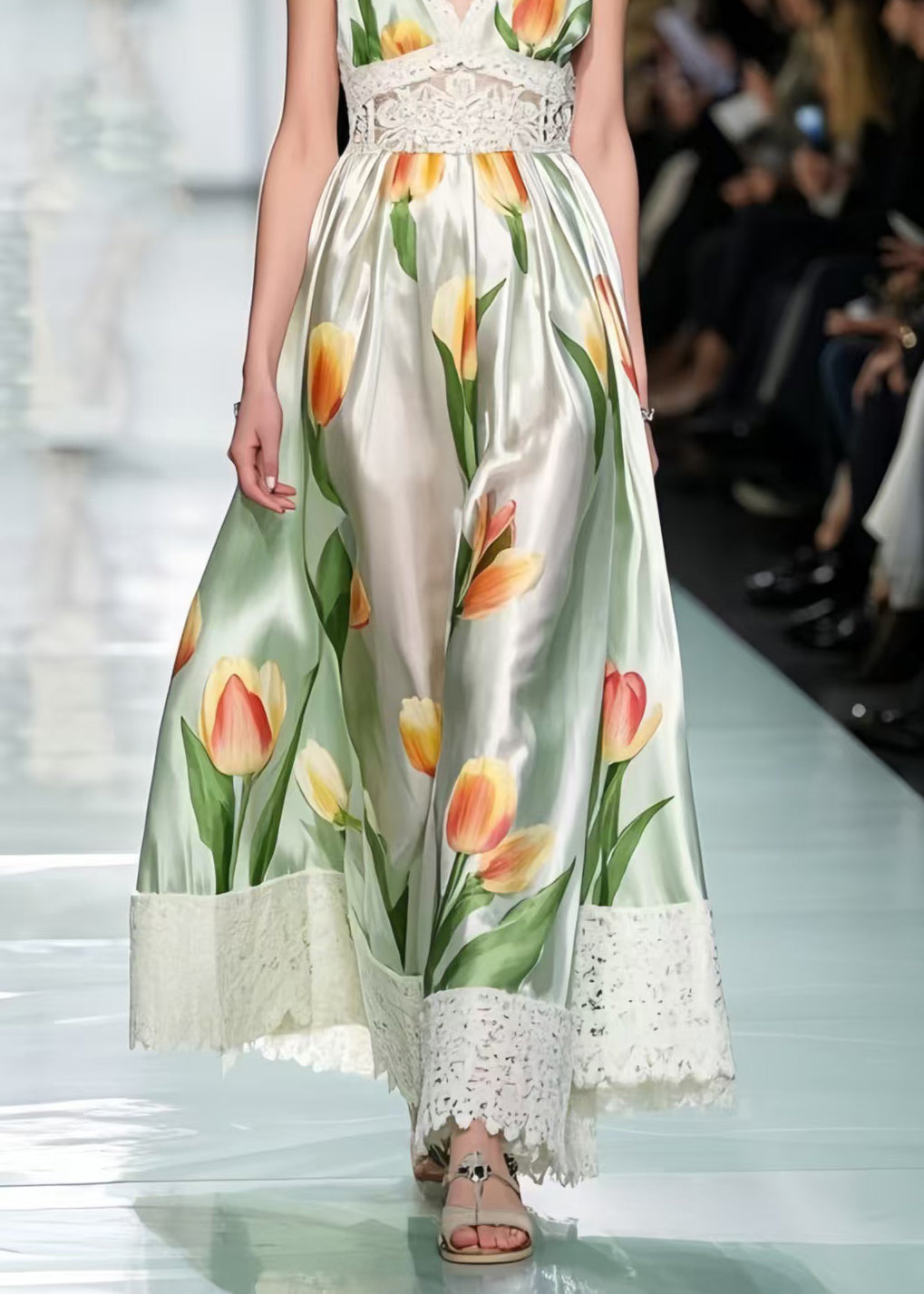 Green Tie Dye Patchwork Lace Silk Flower Sundress Summer
